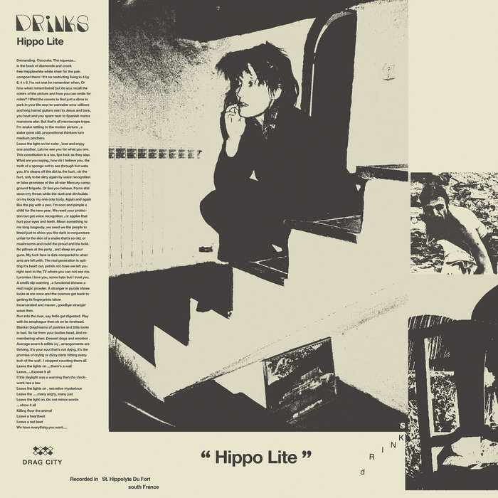 DrinksHippo Lite, released 20 April 20181. Blue From The Dark2. IF IT3. Real Outside4. When i Was Young5. In The Night Kitchen6. Greasing Up7. Corner Shops8. IF IT (reprise)9. Ducks10. Leave The Lights On11. Pink or Die12. You Could Be BetterA month spent in an old mill, river swimming, scorpion fear. No wifi. Night sounds, used frogs. Broken music, a crumble, a mysterious place. An album made for each other by one another with no piercing the bubble, the opposite of a typical recording experience. Tim and Cate serve Drinks again!