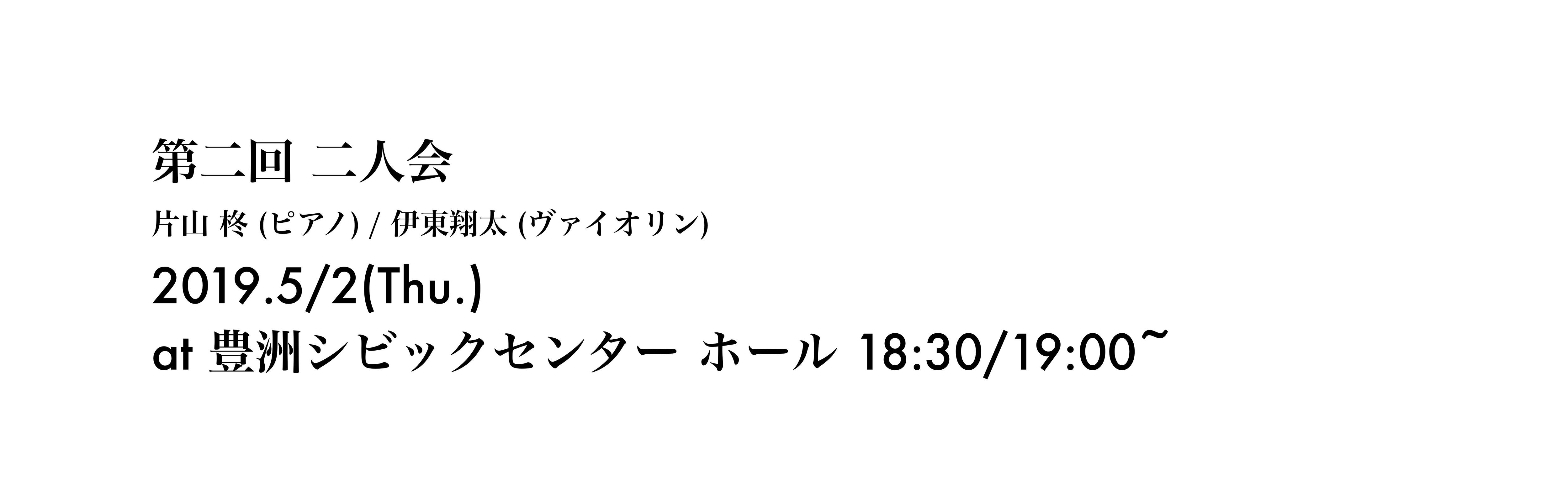 「第二回 二人会」2019. 5/2 (木)豊洲シビックセンター ホール(東京都江東区豊洲2-2-18)18:30 / 19:00から全席自由一般 2000円学生 1500円出演:片山 柊 / ピアノ伊東翔太 / ヴァイオリンお問い合わせはContact:futarikai2017[at]gmail.com にお願いいたします。([at]を@に換えてお送りください)