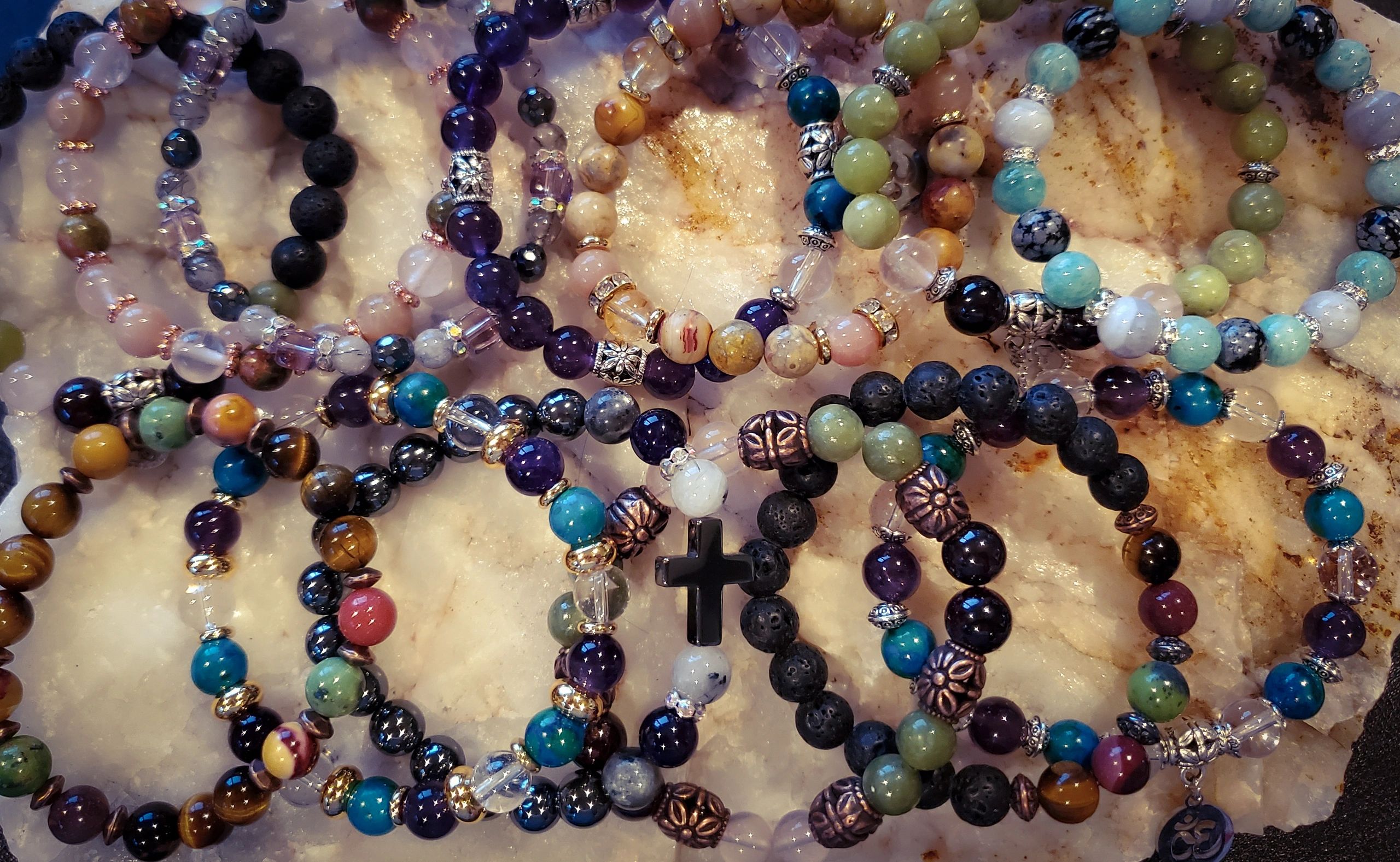 High Energy Healing Bracelets Inspired By Universe. Each one is made specifically for the individual and has a written explanation of each stone's meaning.