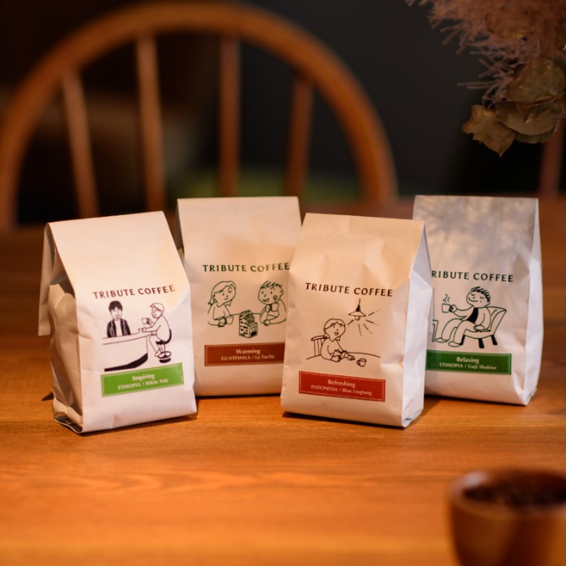 京都・河原町三条でカフェと焙煎所を営む、TRIBUTE COFFEEのオンラインストアです。《お知らせ》*梱包資材のサイズによっては、パッケージの形を変えてお届けする場合がございます。 商品画像のパッケージの形と異なることがありますのでご了承ください (パッケージ自体のデザインや寸法は同じです・品質は問題ございません)。《なりたい気分になるコーヒー~TRIBUTE COFFEEからの新提案》高品質のスペシャルティコーヒーを、生産地や品種といった従来の切り口だけではなく、リラックスしたい時やリフレッシュしたい時など、その時の「なりたい気分」でお選びいただけるコーヒーとしてご提案します。取り扱っている6種のコーヒー豆商品を、「なりたい気分」で4つのカテゴリーに分類しました。『4つのカテゴリー』Relaxing(リラクシング) ~リラックスしたい気分の時に~ おだやかで口当たりが良い風味。 潤いや癒しを感じさせます。 ☆エチオピア クジ・シャキソ ☆ブラジル ダス・フローレスRefreshing(リフレッシング) ~リフレッシュしたい気分の時に~ 個性的で際立った風味。 活力やひらめきを感じさせます。 ☆インドネシアブルーリントン ☆コロンビア エル・サフィーロWarming(ウォーミング) ~ほっこりしたい気分の時に~ 調和が取れた風味。 心が通う瞬間のように温かくなります。 ☆グアテマラ ラタ・シータ Iispiring(インスパイアリング) ~コーヒーをさらに楽しみたい気分の時に~ 鮮やかな酸味とライトな風味。 新たな発見にワクワクします。 ☆エチオピア ホワイトナイル例えば、リラクシングに分類されるコーヒー豆として、エチオピア クジ・シャキソがあります。この豆の心地よいコクと甘くフルーティな風味が、リラックスしたい気分を誘います。これらのように、コーヒー豆が元来持っているポテンシャルを、自家焙煎することで、カテゴリーの気分にあうように引き出します。パッケージデザインのイラストはNHK番組2355の「バー仮説」を手がけた飯田千里さんにお願いしました。「なりたい気分」を親しみやすく情緒的なイラストで表現していただきました。----------------------------------------------------------------------------------------------------------------------------------------ご利用案内■商品の価格は税込です。■送料、配送について・配送料は370円です。郵便局のレターパックライトで郵便ポストへのお届けとなります(一部除く)。・お買い上げの合計金額が4,000円以上の場合は送料無料です。・ご注文後3日以内に発送いたします。■お支払方法についてお支払いはクレジットカード、銀行振込、コンビニ・Pay-easy決済、キャリア決済、後払い決済をご利用いただけます。----------------------------------------------------------------------------------------------------------------------------------------《TRIBUTE COFFEEについて》おいしいコーヒーを中心に、食器や道具、椅子やテーブルから、流れる音楽や一緒に読む本まで、その空間全てを楽しんでいただきたいという想いで、コーヒーとお店を作っています。https://www.tribute-coffee-kyoto.com/高品質のスペシャルティコーヒーを厳選して、豆の持っているポテンシャルを最大限に引き出す焙煎を心がけています。コーヒーが苦手という方にこそ試していただきたいコーヒーです。ミルクを入れなくてもおいしく飲めるコーヒー、冷めてもおいしく、自然に飲み干すことができるコーヒー、それでいて平凡ではない、個性豊かな味わい深いコーヒーを目指しています。トリビュートコーヒーを、ぜひご家庭や職場でお楽しみください。《 当店が使用しているスペシャルティコーヒーについて 》最高品質のシングルオリジンコーヒーを、生産者と長期的に信頼関係を構築して、適正な価格で調達している取引先様から入手しています。特定の農園や地区において生産され、その土地のテロワール(自然環境要因)が表現されていて、魅力のある風味特性を持つ、上質なワインのように楽しむコーヒーです。《 焙煎に対するこだわり 》焙煎を、パンや肉を焼く加熱調理と同じような「料理」とイメージして、いかに火を通して持ち味を最大限に引き出すかを考えています。コーヒーという飲み物を、お客様が「おいしい」と感じる理由は何かを追求して、お客様の声に耳を傾けながら、自分が学んだ焙煎理論を実践しています。《 豆の鮮度管理について 》■豆袋にはボタン型バルブを取り付けています。豆から発生するガスを袋の外に出し、コーヒーの酸化を防ぎます。また外気は入らないため、鮮度保持に優れています。《 おいしくコーヒーを楽しむために 》■挽き方はお選びいただけますが、豆のまま購入いただき淹れる直前に挽くことをおすすめしています。■開封後は、密封容器やチャック付き密閉袋で保管して、2~3週間を目途にお召し上がりください。