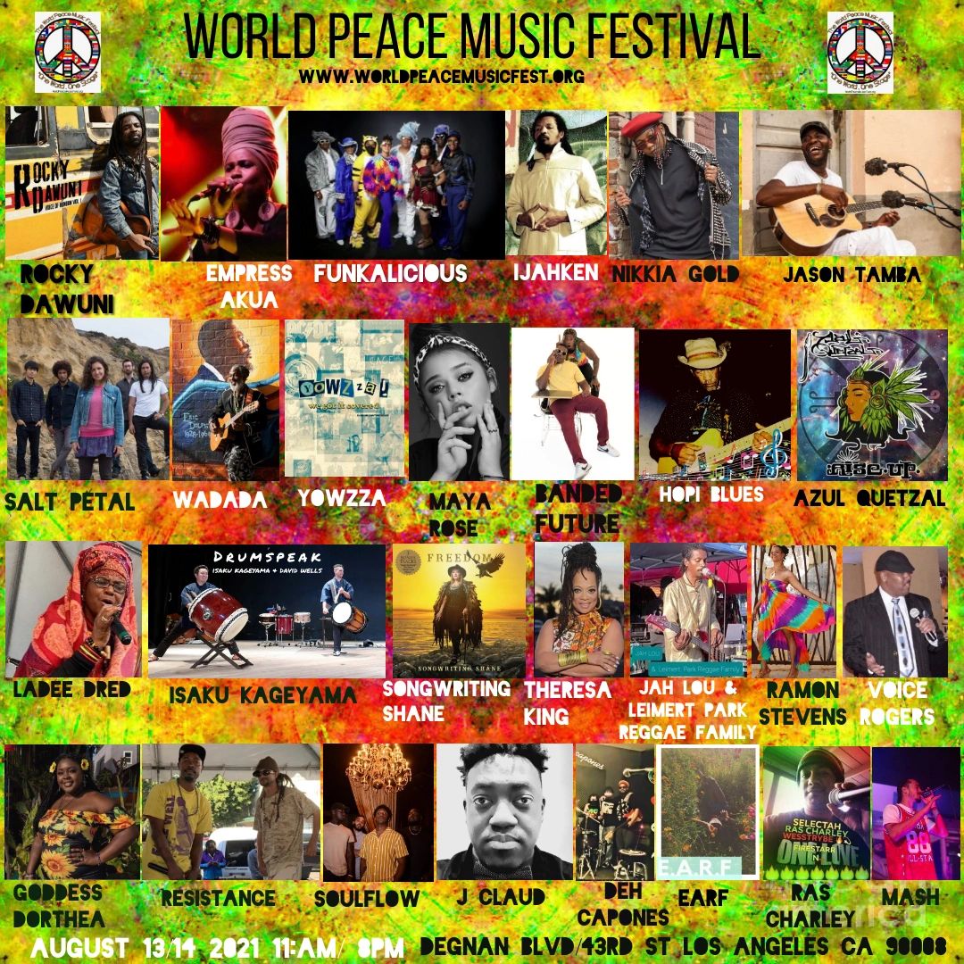 Open Arms Food Pantry presents the World Peace Music Festival taking place in the heart of Los Angeles on August 14-15 2021 from 11am-7pm in Historic Leimert Park Village. Enjoy the sounds of over 25 global artists throughout our two day event. Support small businesses and creatives in our marketplace and foodies can enjoy are food concession area with LA's best trucks and food booths. arts x cultural event