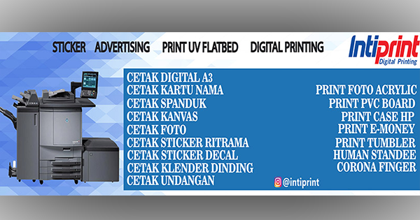 Printing Online yang murah dan mudah, Digital Printing Jakarta Barat, Siap melayani seluruh Indonesia dan memberikan berbagai kemudahan, untuk memenuhi segala kebutuhan anda dalam percetakan media promosi dan lain-lain. Dengan harga yang terjangkau, hasil produk dengan kualitas terbaik, dilengkapi dengan kecanggihan teknologi mesin cetak, serta tenaga kerja yang handal, bertanggung jawab dan professional dibidangnya. Menjadikan INTIPRINT sebagai solusi tepat dan terbaik untuk anda.