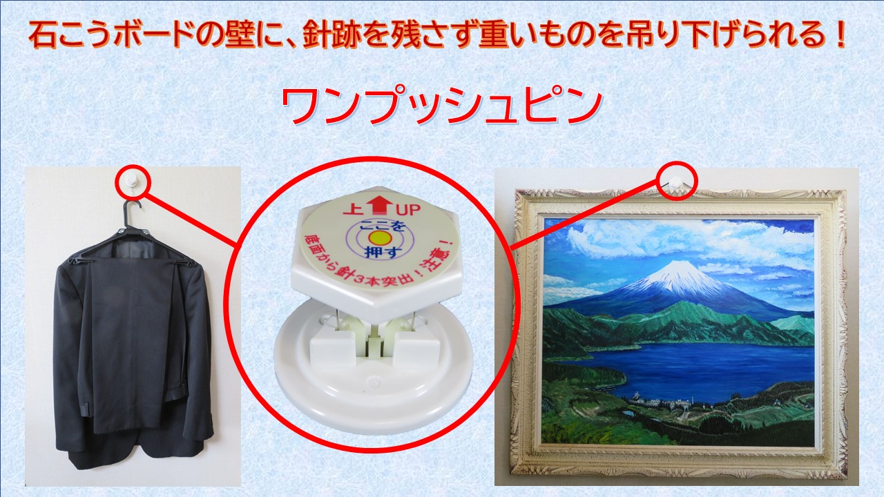 石こうボードの壁にワンプッシュ! 手の平でひと押しするだけでしっかり取り付け完了! 取り外しも簡単で、針跡もほとんど残らない! 石こうボードの壁に、大きな絵画やスーツも掛けられます! 天井が石こうボードであれば、天井からプランターやビニールシートも吊り下げられます!