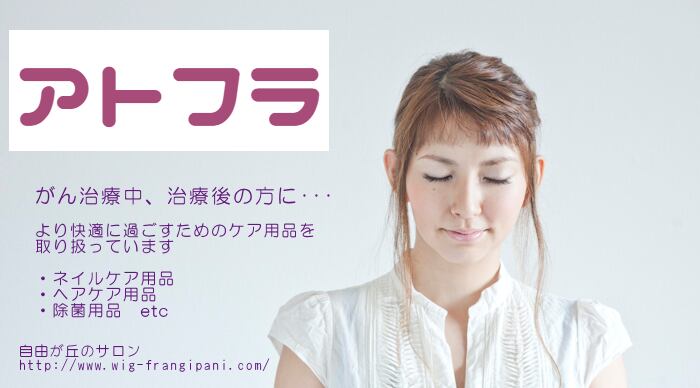 「アトフラ」自由が丘にある、髪と地肌の健康にこだわったオーガニックビューティーサロン「アトリエフランジパーニ」のショップです。抗がん剤治療で様々な副作用に悩む方に美容を通してサポートを行っています。店舗でも販売している商品(抗がん剤治療中や治療後に役立つ商品)を取り扱っています。