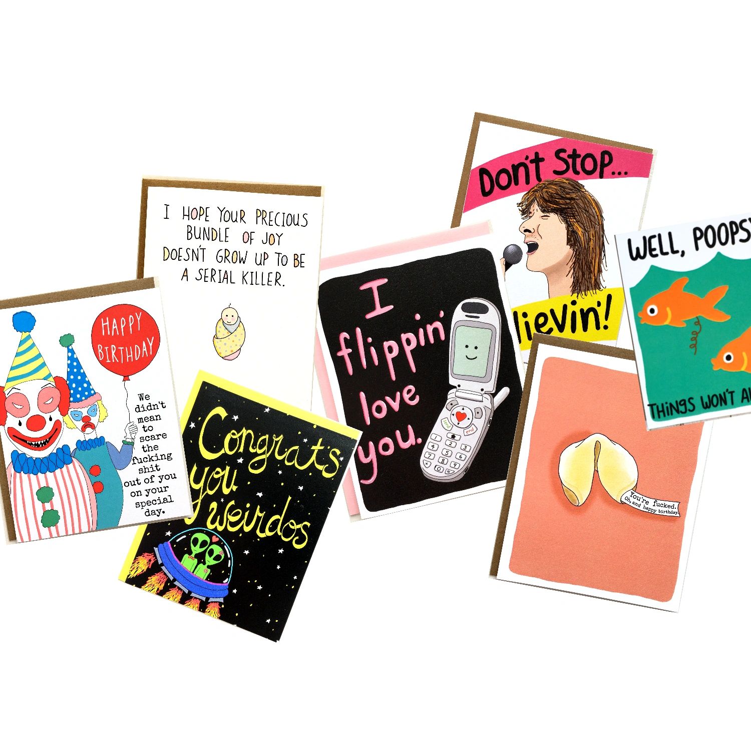 Sassy, snarky, unique, funny greeting cards, stickers and stationery that offer sweet sentiments and swear words.