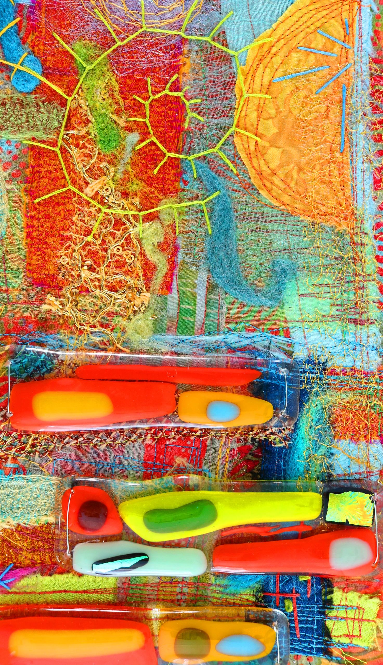 Collaged works of fiber art and fused glass in two and three dimensions.