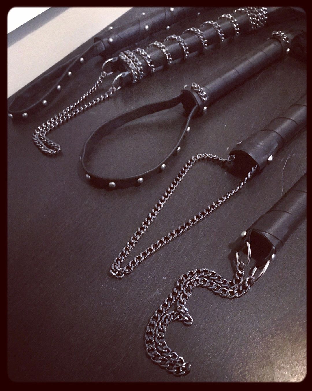 Custom black leather specialty items handmade for pleasure and pain.
