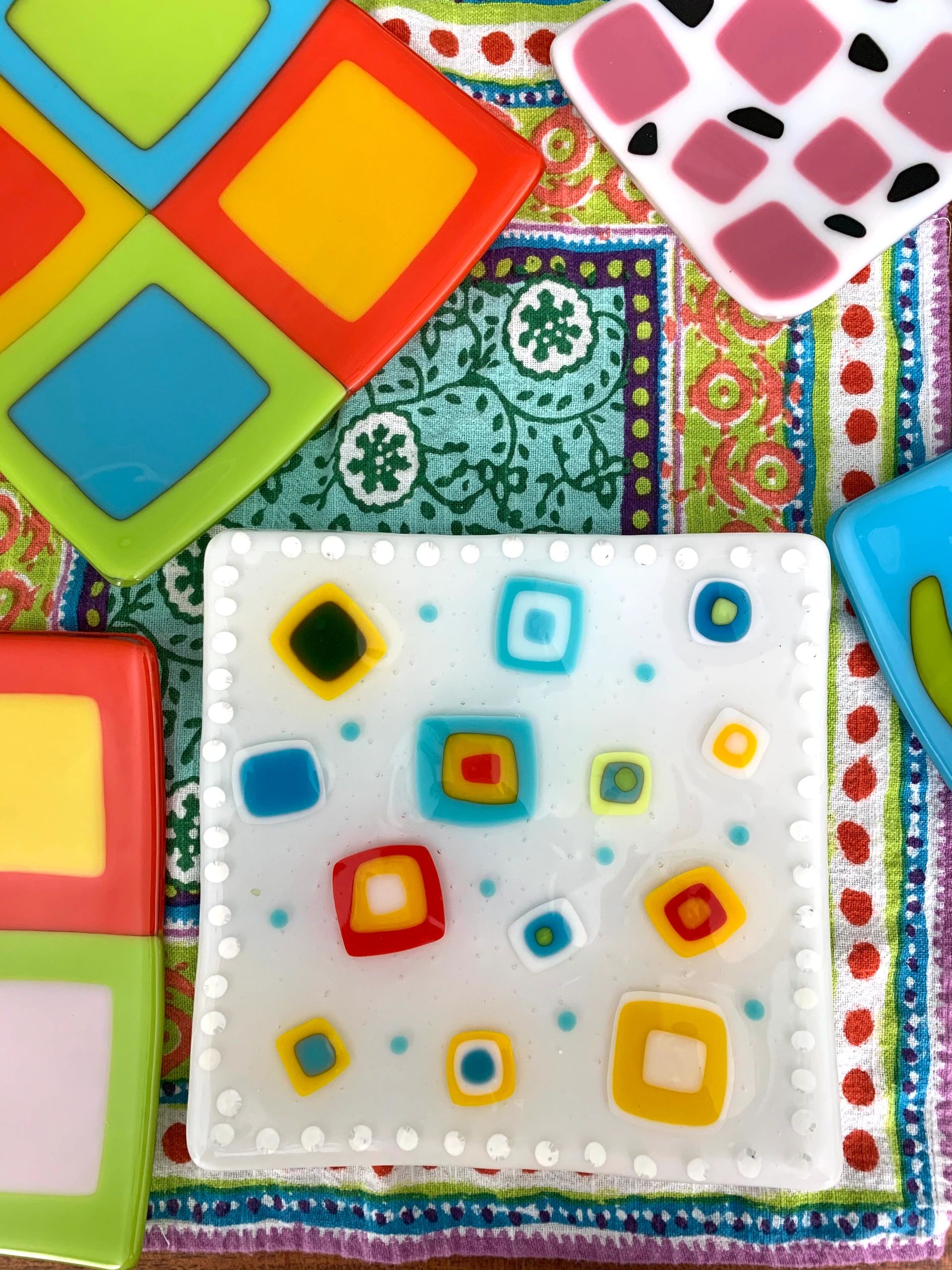 Shop CJ Yummies for color-splashed art glass by Cathy Izenson Jenkins. Cathy creates handcrafted, fused glass jewelry, home decor and accessories. Her signature style blends delicious, mouth watering color with unique bold contemporary designs. Whimsical, yet stylish, Yummies collection by Cathy includes handmade fused glass dishes, plates, candleholders, platters, bowls, pendants, earrings, key rings, and belt buckles. Custom orders welcome.