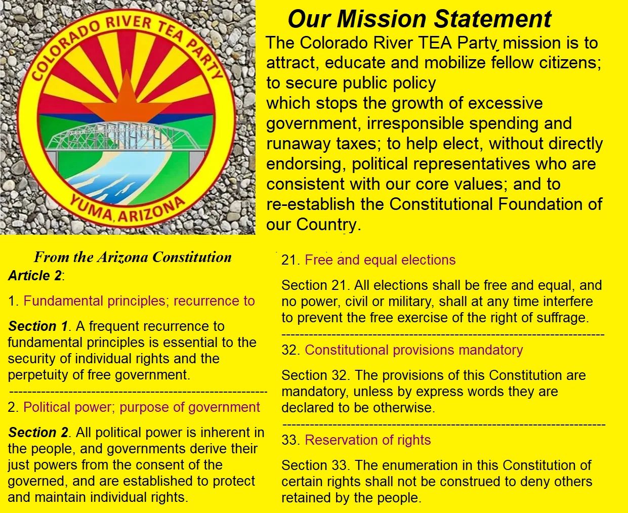 Our mission is to attract, educate, organize, and mobilize our fellow citizens to secure public policy, and elect conservative political representatives. Yuma tea party patriots