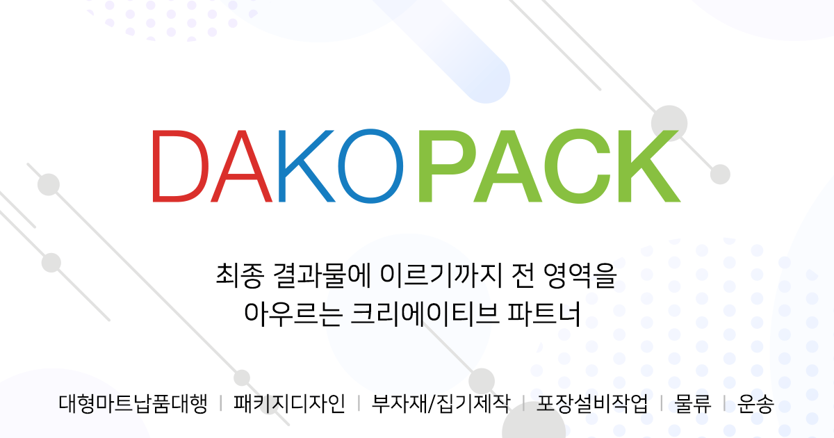 Keywords: 다코팩, 대형마트납품대행, 패키지디자인, 부자재/집기제작, 포장설비작업, 물류, 운송