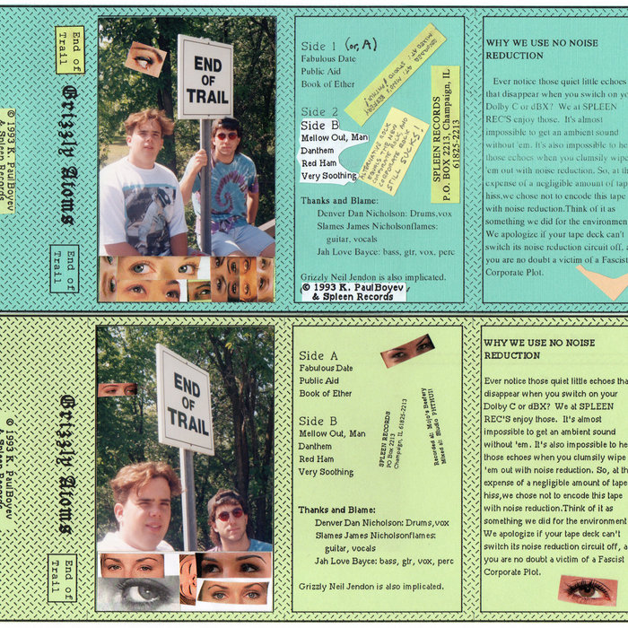 deadBells RecordingsEnd of Trail by Grizzly Atöms, released 17 June 20221. Fabulous Date2. Public Aid3. Book of Ether4. Mellow Out, Man.5. Danthem6. Red Ham7. Very SoothingRecorded at Mojo's Beefery in Urbana, IL in 1992 and mixed at Studio PHTHUI!, End of Trail signaled the high water mark for this handsome Tinley Park power trio. This was because it was to be their only release. Never Peak Early, I guess?End of Trail was issued in limited edition handmade cassettes, with J-card inserts painstakingly created using locally sourced paper materials locally color copied at an artisanal Kinko's on Springfield Ave. Cassettes were spray-painted with Krylon products, half kind of Kelly Green, and the other this sort of blue-green.