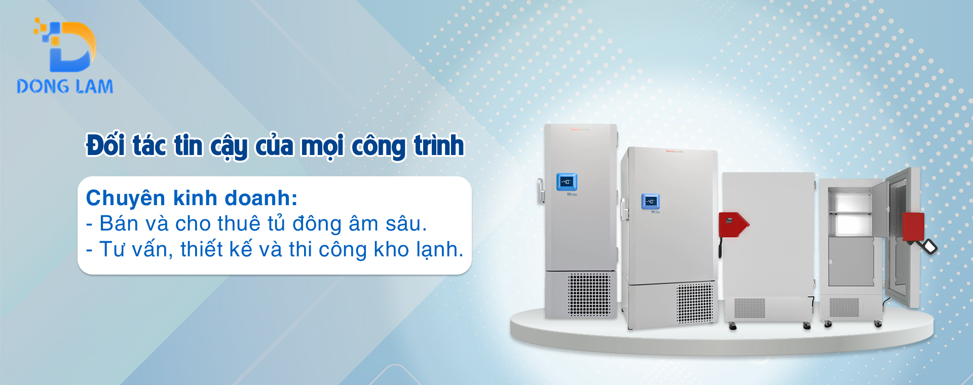 Công ty TNHH Đông Lam chuyên tư vấn, thiết kế, thi công lắp đặt hệ thống kho lạnh, bán và cho thuê các thiết bị điện lạnh chuyên dụng cho các doanh nghiệp trong và ngoài nước, các sự kiện triển lãm.
