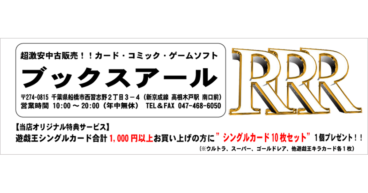千葉県船橋市で創業17年。高根木戸駅前のカード、コミック、ゲームソフトの「ブックスアール」です!!特に遊戯王カードは創業以来、取り扱っております。 【当店オリジナル限定サービス】 遊戯王シングルカード合計1,000円以上お買い上げの方に”シングルカード...