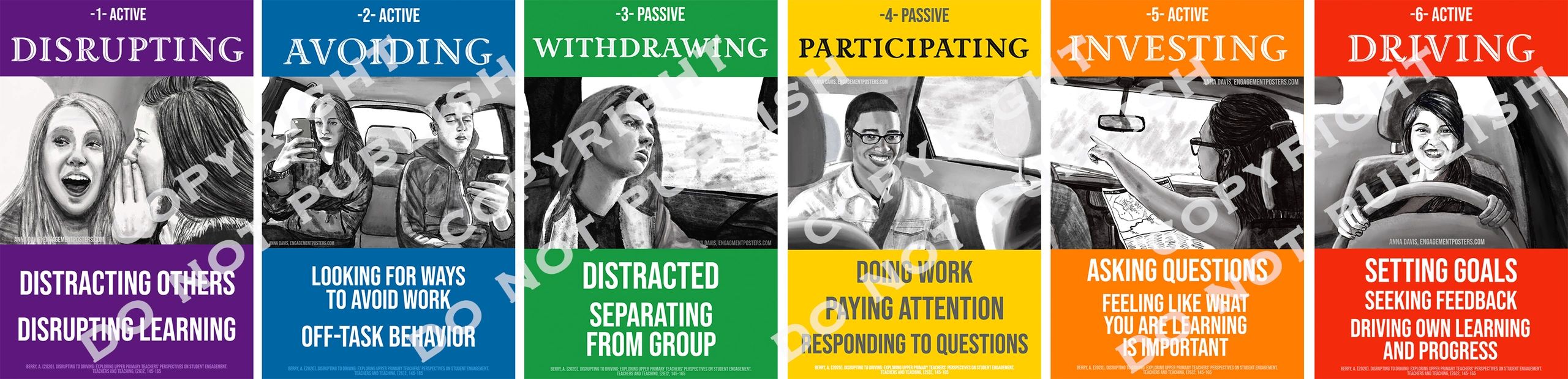 Show your students what engaged learning looks like. These engagement posters can be displayed to help students monitor their own learning. These images are based off of Amy Berry's research about the Engagement Continuum.