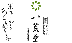 原料のもち米作りから手焼きまで一貫生産。近江の自然のめぐみを一枚いちまい心を込め、焼き上げてお届け。春は梅、夏は桔梗、秋には萩が咲きみだれ、すすきが波打ち、冬には雪の華散るここ比良山麓の自作田で出来たもち米を使って、手焼きの「あられ」「かきもち」を昔風につくっています。お米は籾で保存し、必要なだけ精米しセイロで蒸し、杵で搗き、餅を網に並べ、手間をかけてくり返し両面をこんがり焼き上げた品々です。どうぞごゆっくり御賞味くださいませ。 有限会社 八荒堂〒520-0521滋賀県大津市和邇北浜57※販売店も営んでおります。近くへお越しの際は、ぜひお立ち寄りください。ブランドサイト→ www.hakkoudou.net