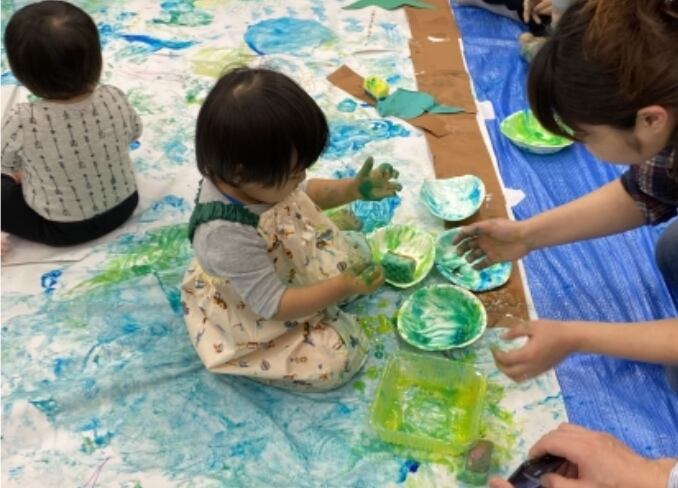 絵の具で色が変化していく様子を見たり初めての感触に触れて脳を刺激する。日常の【それやっちゃダメ!】から開放されて好きなようにあそぶ。「無制限あそび」は、これからのAI時代を生き抜く”感性”と”五感”の発育を促すあそびです。脳科学上、子どもの脳の基礎は【3歳までに8割が完成する】といわれています。そんな貴重なこの月齢に、ワクワクドキドキする体験機会を。子どもの創造力発想力をぐんぐん伸ばしながら、親子の思い出づくりの場にもなっています。