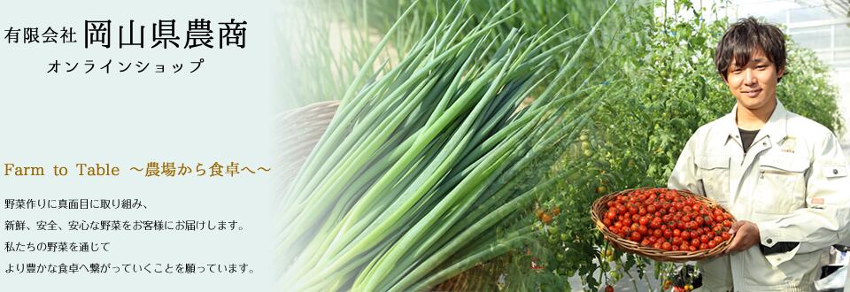 岡山県農商のオンラインショップです。お店ではなかなか買えない方に、私たちの商品をお届けしたいと思いネットショップを開設しました。岡山県農商では、主力商品の「きびトマト」、「桃太郎ネギ」をはじめ、季節野菜などの生産から販売までを行っております。「farm to table」をモットーにより良い商品を直接お客様の手元にお届けできるよう心がけております。【商品ご注文の際の注意点】●天候に左右されやすい商品ですので、1日に発送できる数量に限りがございます。配送日のご指定による注文はお受けできませんので、ご了承ください。●商品の品質管理には万全を期しておりますが、完熟の状態で発送する都合上、気温の変化・輸送中の衝撃などで果実が裂ける場合がございます、ご理解賜りますようお願い申し上げます。