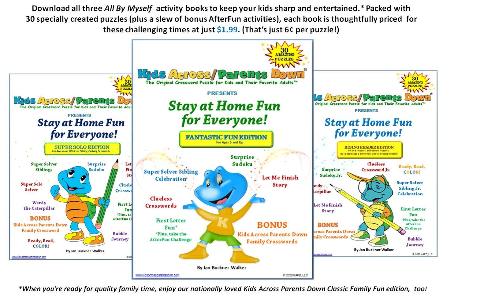 Kids Across Parents Down Downloadable E-Books are fun, educational crossword puzzles that work from home parents can comfortably offer kids during the workday.
