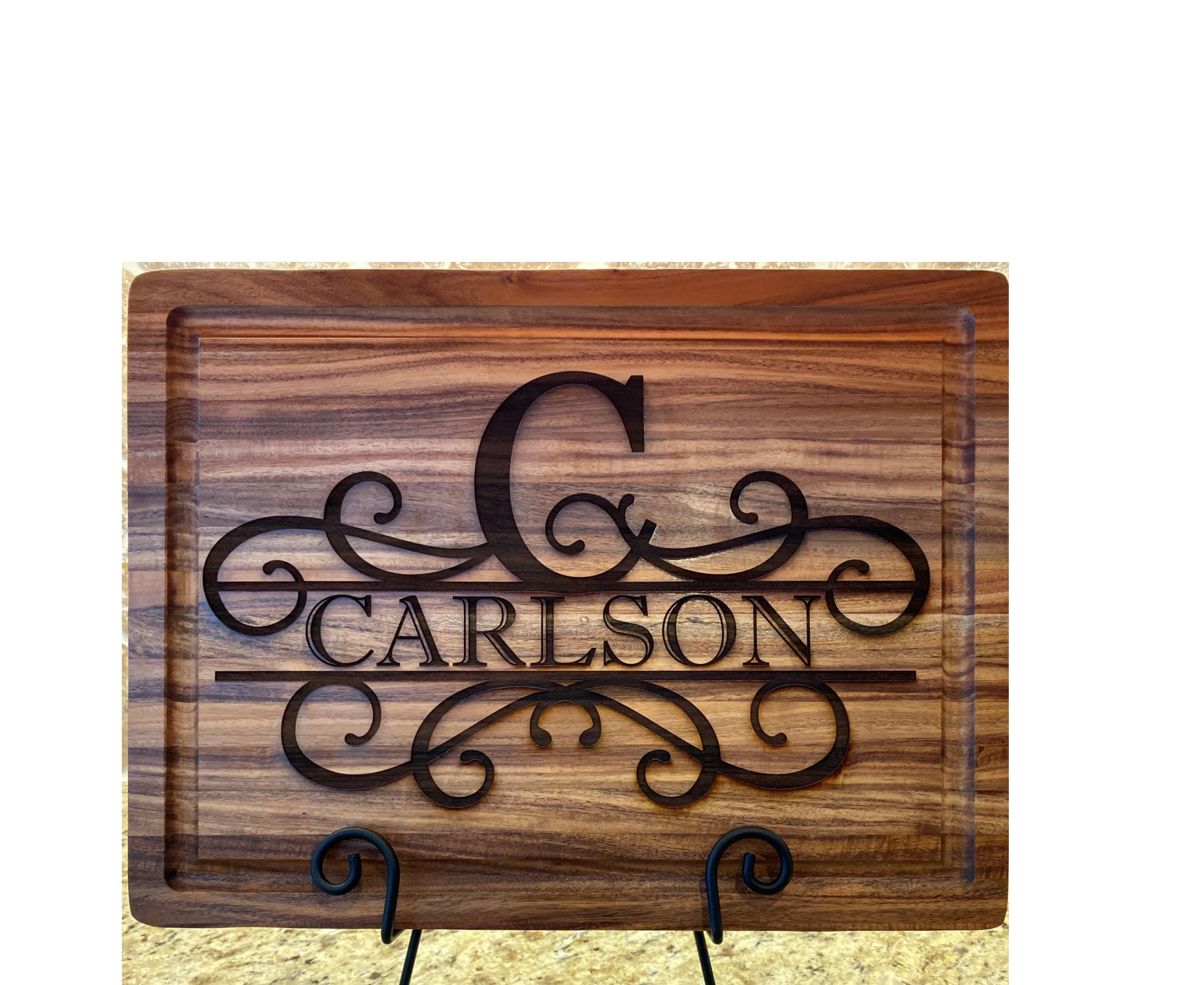 Personalized gifts including cutting boards, cork trivets, wood spoons, lazy susan, baking dishes, and much more.