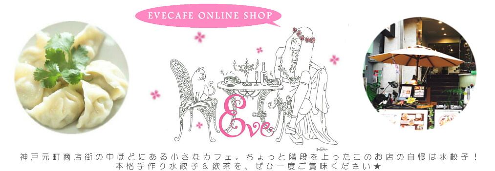 ●店名 水餃子が食べれるカフェ「イヴカフェ ~Evecafe~」 〇店舗情報2011年4月に開業いたしました。 神戸元町商店街にカフェとして店舗を構え、お食事は中華&飲茶をメインとしたお料理、カフェタイムにはアレンジコーヒーや、オリジナルMIXジュース、スイーツは自家製ワッフルやチーズケーキ等、幅広くご提供しております。 〇水餃子へのこだわり中国生まれのおじいちゃんが昔し家庭で作ってくれた本場の味を忠実に受け継ぎ、皮からすべて手作りに、こだわっています。 具材には、選び抜かれた国産豚肉・白菜・ニラ・エビを使用。 豚肉もブロックから叩きミンチ状にし、エビもプリプリ感を残すため、わざと荒く刻んで入れております。 中国の水餃子は日本のと違いにんにくは不使用。 女性の方や、お仕事中の方にも安心してお召し上がり頂けます。モッチリぷりぷりの皮としっかりした具の食感をぜひ一度お試しください♪〇材料について豚肉は国産品を使用してます。 〇アレルギーの表記について 当店で製造する商品の全ては乳、卵、小麦粉、エビ(魚介類)を含む商品と同じ製造ラインです。 アレルギー症状の重い方は、お控えいただきますよう固くお願い申し上げます。 〇賞味期 限について保存料等、添加物無添加により、賞味期限は製造日(出荷日)を含めて2か月程度です。 到着後は速やかに冷凍保存をお願いいたします。 〇送料について ・10000円以上のお買い上げで送料無料 離島、一部地域は追加送料がかかる場合がございます※1小口につきのお値段になります。 〇配送について ・ヤマト運輸で冷凍配送いたします。・代引きの場合‥当店からの返信メール送信後、3日以内に発送いたします(店舗定休日水曜除く) ※手数料¥324が別途かかります。◆衣類・雑貨の発送について◆・メール便で発送可能なものは基本をメール便(¥160)にて発送させて頂きます。・メール便発送不可のものはヤマト運輸にて発送させて頂きます。・システムの都合上、ご購入時の送料の表示がクール便の料金になっておりますが、改めてこちらから正しい料金をお知らせさせて頂きますので、ご確認の上ご了承くださいませ。・ヤマト運輸の発送料金はクール便から¥200引いた金額になります。ご確認くださいませ。・お振込みの場合‥ご入金確認後、2日以内に発送いたします。 発送完了後は、メールにてご連絡いたします。・日にち、時間指定等ありましたら、備考欄にご記入ください。