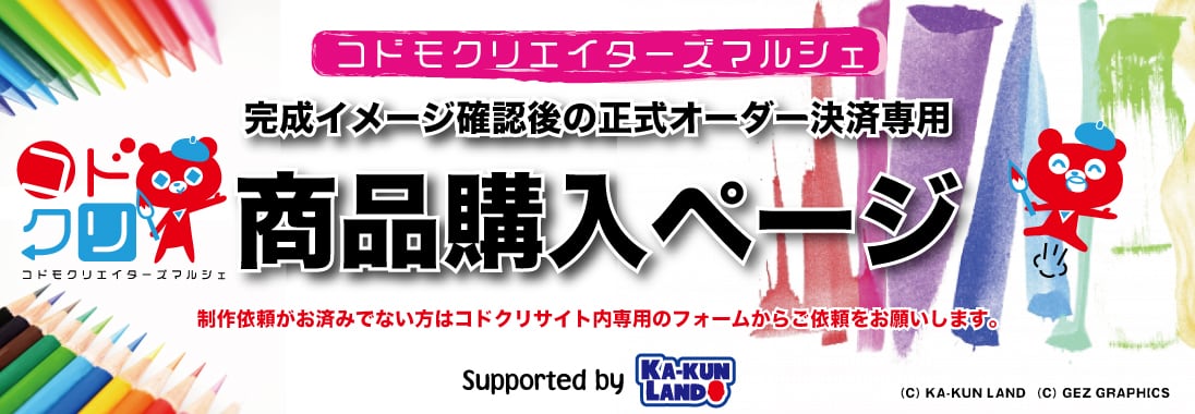 コドモはみんなクリエイター。子供が書いた絵が世界でたったひとつのオリジナルグッズになるサイト。コドモクリエイターズマルシェ(通称 コドクリ)の決済専用サイトです。制作依頼やサービス内容はhttp://www.kodocre.com/にてご確認ください。