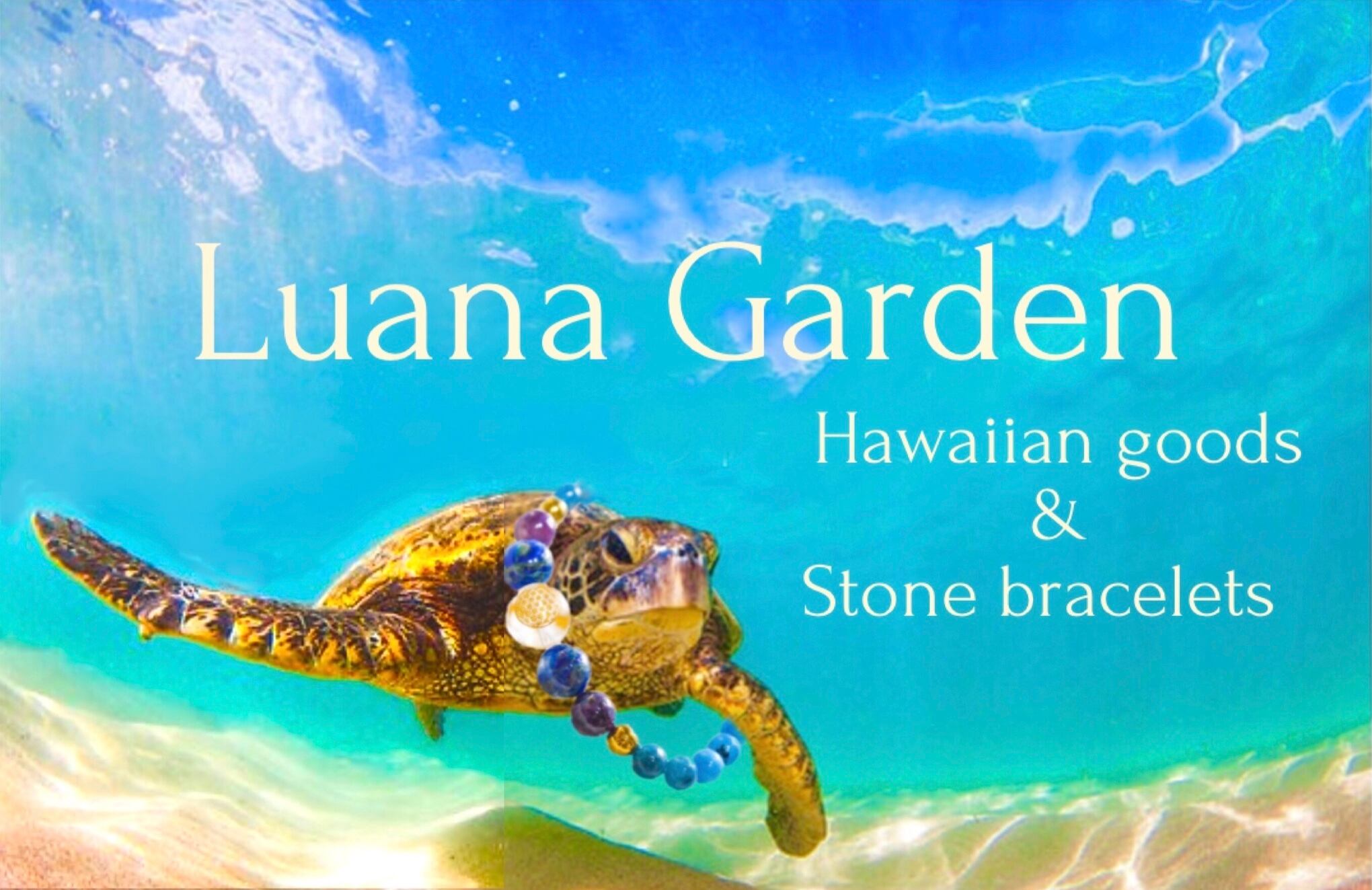 ハワイアンな帆布バッグ、リボンレイ、天然石ブレスレットを販売しています。