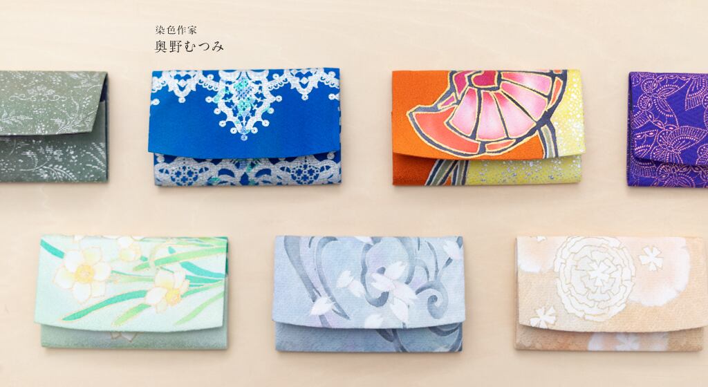 ご訪問ありがとうございます。染色作家奥野むつみです。京友禅の伝統の技法やデザインはそのままに、今をときめく配色にリニューアルしました。絹は発色がとても美しく、真珠のような光沢があります。洋服や着物では身にまといにくい色合いも、小物で気軽に楽しんでほしい。そんな思いで制作したカードケースです。鮮やかな色彩を日常で楽しんでいただけますように。奥野むつみ作家ページはこちら。https://www.mutsumi-yuzen.com/