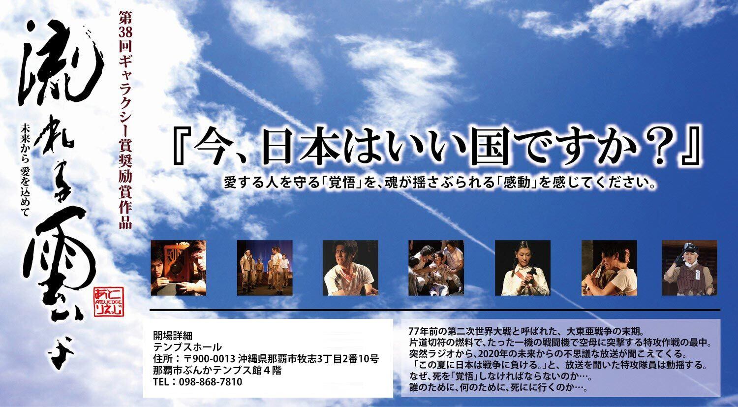 第38回ギャラクシー賞奨励賞作品『流れる雲よ』~未来から 愛を込めて~『今、日本はいい国ですか?』人は愛する「家族」のためなら、命を懸けてもがんばれる。愛する人を守る「覚悟」を、魂が揺さぶられる「感動」を感じてください。72年前の第二次世界大戦と呼ばれた、大東亜戦争の末期。片道切符の燃料で、たった一機の戦闘機で空母に突撃する特攻作戦の最中。突然ラジオから、2018年の未来からの不思議な放送が聞こえてくる。「この夏に日本は戦争に負ける。」と、放送を聞いた特攻隊員は動揺する。なぜ、自分達は死を「覚悟」しなければならないのか・・・。誰のために、何のために、死にに行くのか・・・。◇日程平成30年8月24日(金)①開演13:00(開場12:00)平成30年8月25日(土)②開演13:00(開場12:00)③開演18:30(開場17:30)平成29年8月26日(日)④開演13:00(開場12:00)◇場所朝日生命ホール(住所:大阪市中央区高麗橋4丁目2-16 大阪朝日生命館8階) ※地下鉄御堂筋線「淀屋橋」駅 12番出口(南出口西側)直結◇料金〈前売〉4,000円(大学生以下1,000円)〈当日〉5,000円(大学生以下2,000円)本公演についてのお願い※未就学児童はご入場できませんので、予めご了承ください。◇主催「流れる雲よin大阪」実行委員会〒541-0041 大阪市中央区北浜4-2-13-3F(株式会社ヴィーノ内)◇申込「流れる雲よin大阪」ホームページよりhttp://nagarerukumoyo-osaka.com