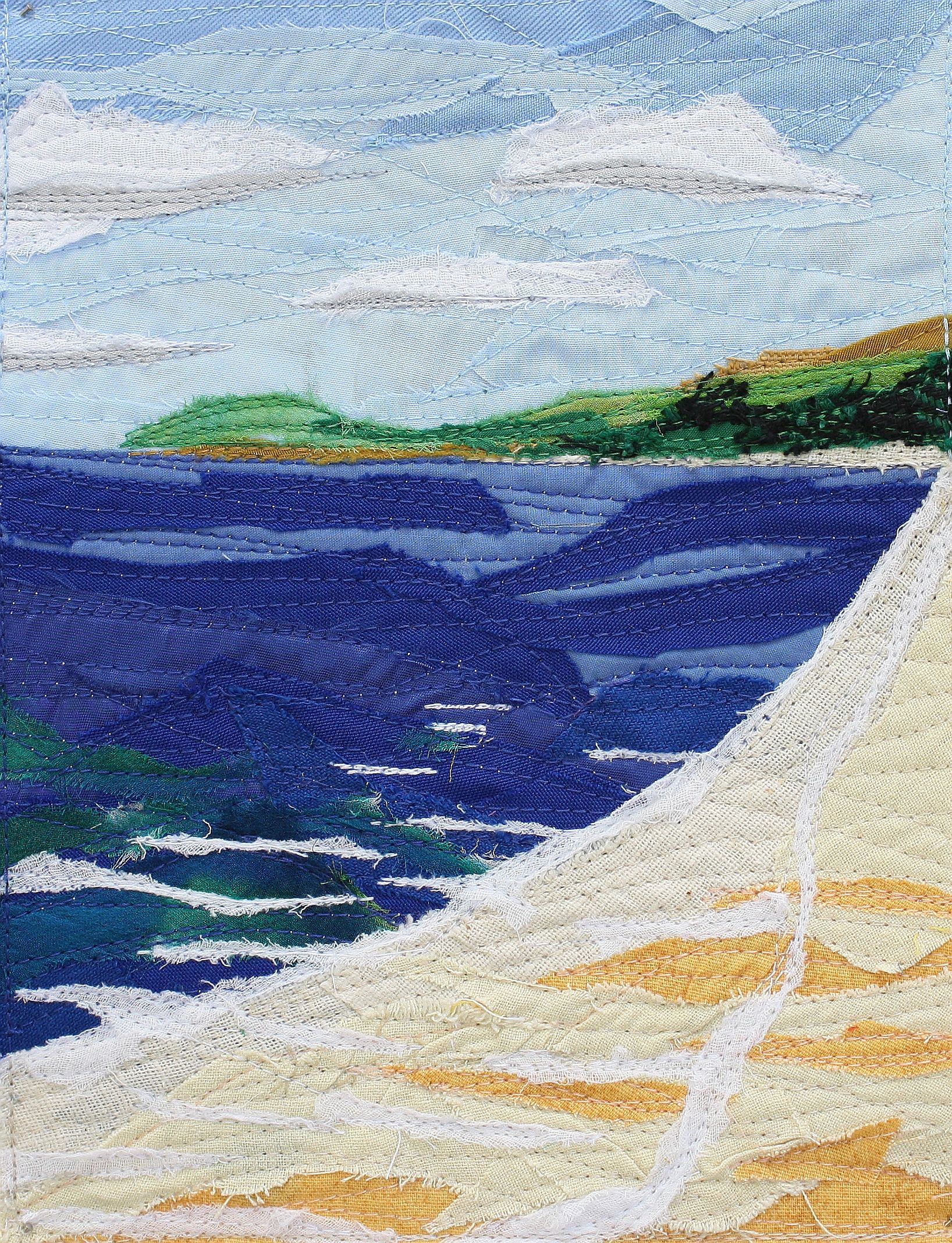 Our fabric art uses cloth as if it were paint. Recreating scenes from our environment by cutting the colour from existing cloth then sewing it all down.