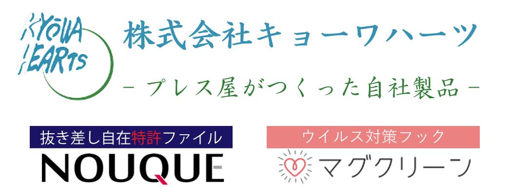 キョーワハーツ自社ショップへご来店いただきありがとうございます。キョーワハーツは、横浜にある創業70年の町工場です。複雑で精密な金属部品の加工を手掛けており、「世の中にないものを作ること」を目指しています。キョーワハーツの社名は、「心(hearts)を込めて」という理念を含んでいます。これまで長きにわたって培ってきた金属加工の技術とアイデアを生かして、心のこもった商品をお届けします。自社商品①【抜き差し自在特許ファイル NOUQUE】ファイルされた書類を真ん中から抜き差しできる特許ファイル=ヌーケ・NOUQUEこれまで、穴を開けて綴じるタイプのファイルの抜き差しのわずらわしさを解決する、感動の画期的なファイリングシステムです。だれもがこれまで感じていた、ファイルされた書類の抜き差しのイライラを解消。書類のファイリング時間を3分の1に短縮、外した書類を横に置く必要スペースも必要なく、省スペース、オフィス作業の生産性をアップします。2016年 神奈川工業技術大賞奨励賞受賞。自社商品②【マグネシウム製ウイルス対策フック マグクリーン】電車で…エレベーターで…町中のいたるところで…ウイルスから身を守り、ウイルスを広げないためのタッチレスでウイルス対策!超軽量マグネシウム製フック「マグクリーン」です。世界中の人が抱えるウイルスに対する不安を目の前にしたときに、「自分たちにできることは何かないか」「こんなときだからこそ、世の中にアイデアを発信しよう」という声が社内であがるようになりました。フェースシールドの試作に取り組んだこともありました。 日々さまざまな試行錯誤を繰り返す中で、マグネシウム製ウイルス対策フック「マグクリーン」は生まれました。2020年8月~9月 クラウドファンディングサイトREADYFORにて先行販売