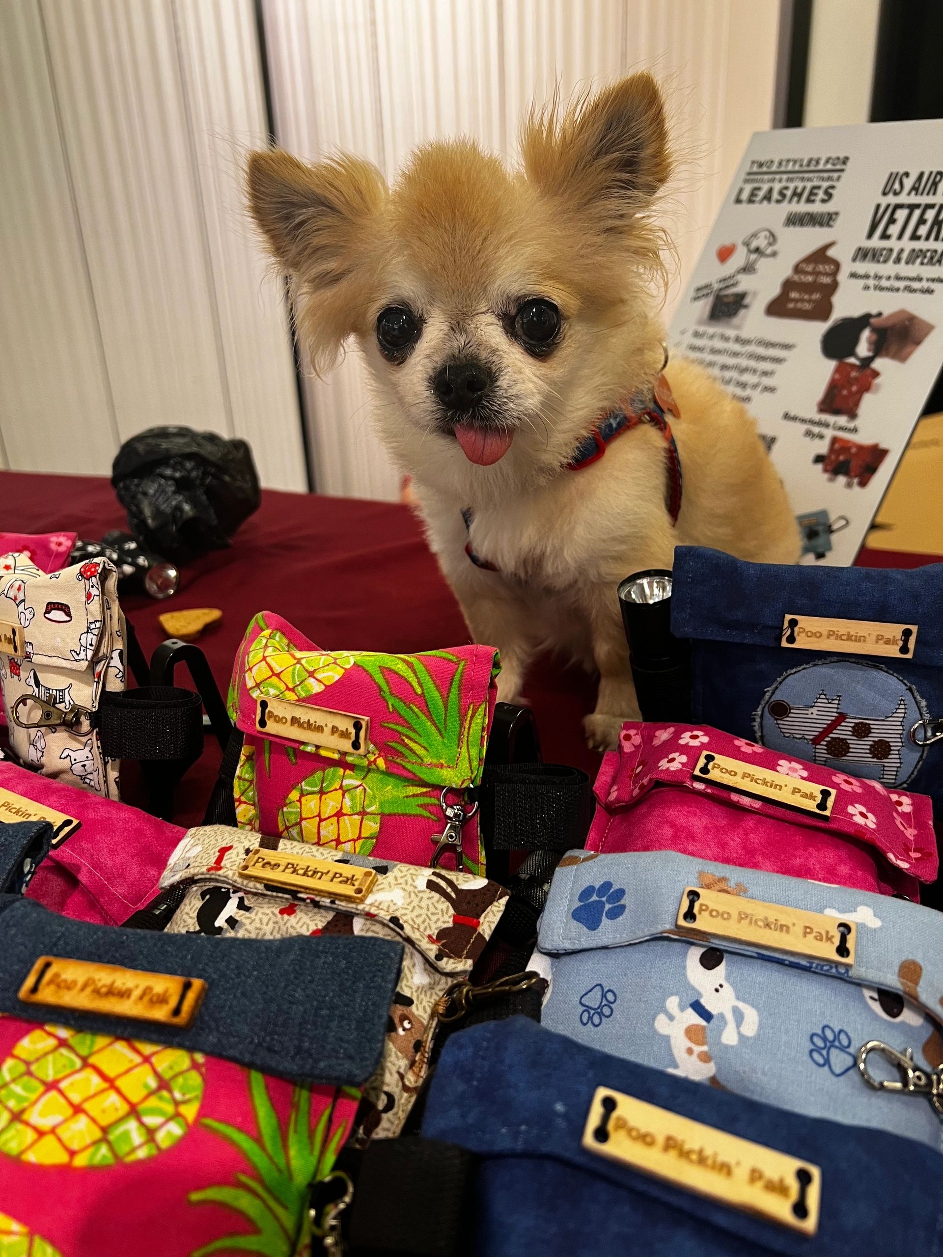 The Poo Pickin’ Pak attaches to any leash, has dog poop bags, hand sanitizer, key clip, “dog flashligjt” & two hanging clips for the used poo bags/pet waste.