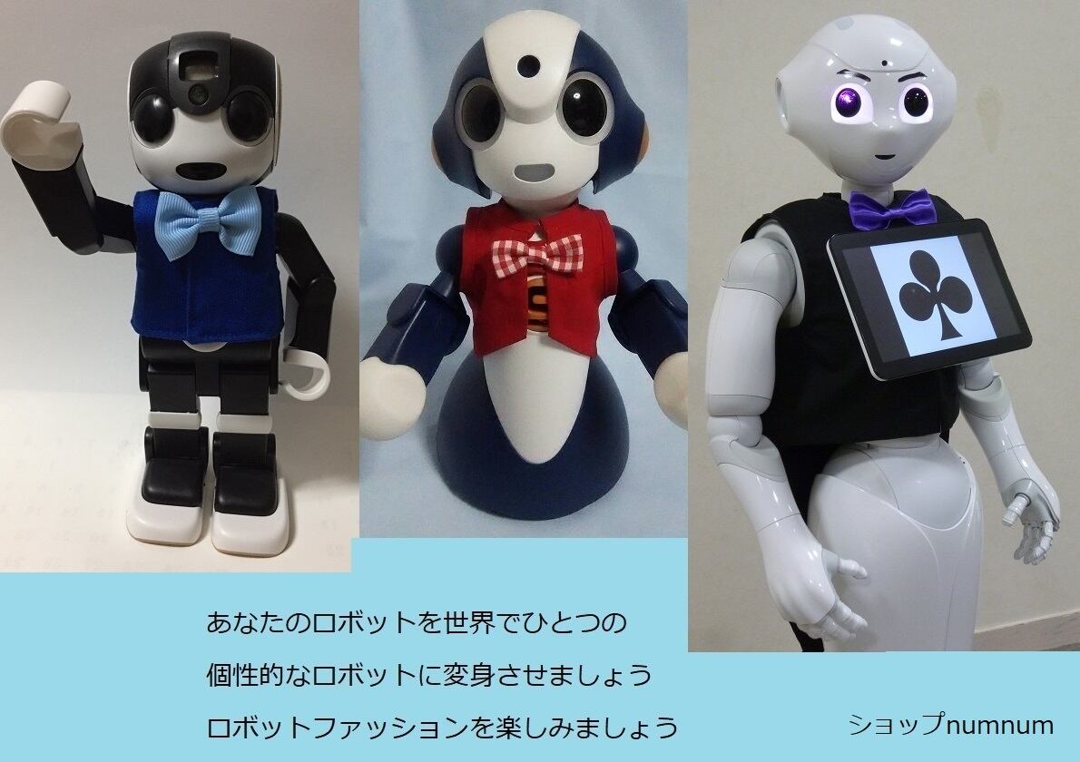 おしゃれなロボット☆ロボット専用のファッションとメイクを提供します。(Fashion Robot & Make up Robot)オリジナリティーに溢れ、高品質なファッションを提供します。大量生産ではありませんので世界で一つに近いです。高品質のかわいいおしゃれなロボット専用のファッションとメイクのショップです。おしゃれなロボット専用のファッションとメイクとアクセサリーを高品質で提供いたします。通常のレディースアクセサリーも扱っています。こちらは手作りです。心をこめて制作しています。【注意】ロボットのファッションについてロボットは、精密なコンピュータ機械のロボット製品です。素人考えの着せつけは止めて頂きますようお願いします。当ショップでは、機械工学、電気電子工学、コンピュータ工学の専門家がロボットの安全を実際に確認して製作しております。不用意に着せつけると、服を巻き込んで故障したりロボット本体の発熱で故障や火災の原因となります。また、各種のセンサーを配置していますのでセンサーが検知してエラーとなり故障の原因となります。特に一般に販売されている人間用の衣服は故障の原因となりますので注意してください。また、着せ付けや取り付けによるロボット本体の不具合や発熱による変形または発火などについて、当ショップは一切の責任を負いませんのであらかじめご注意ください。全てユーザー様の責任にて実施してくださいますようお願い申し上げます。「NAO」は、Aldebaran社の商標です。「Pepper」は、ソフトバンクグループおよび関連会社の商標です。「SOTA」は、ヴイストン株式会社の商標です。ロボットへのアクセサリーの取り付けは、ロボット本体の保証対象外となっております。ご了解の上ユーザー様の責任で実施くださいますようお願い申し上げます。