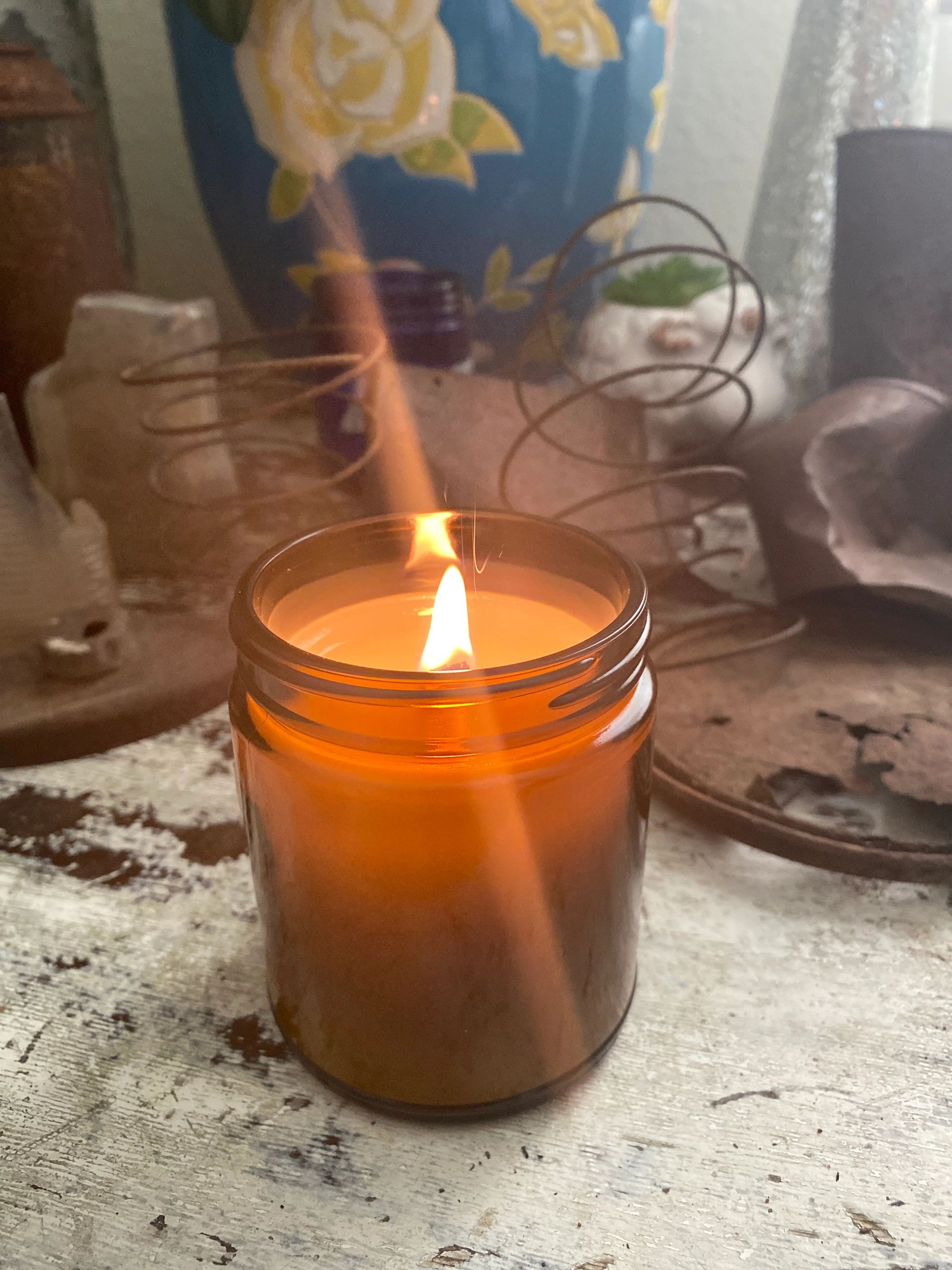 Wooden Wick Container Candles in an Amber glass jar hand-crafted with natural coconut apricot creme wax, wood wicks, phthalate free fragrance oils, recycled labels. The amber glass jar can be cleaned and repurposed to store any treasures.
