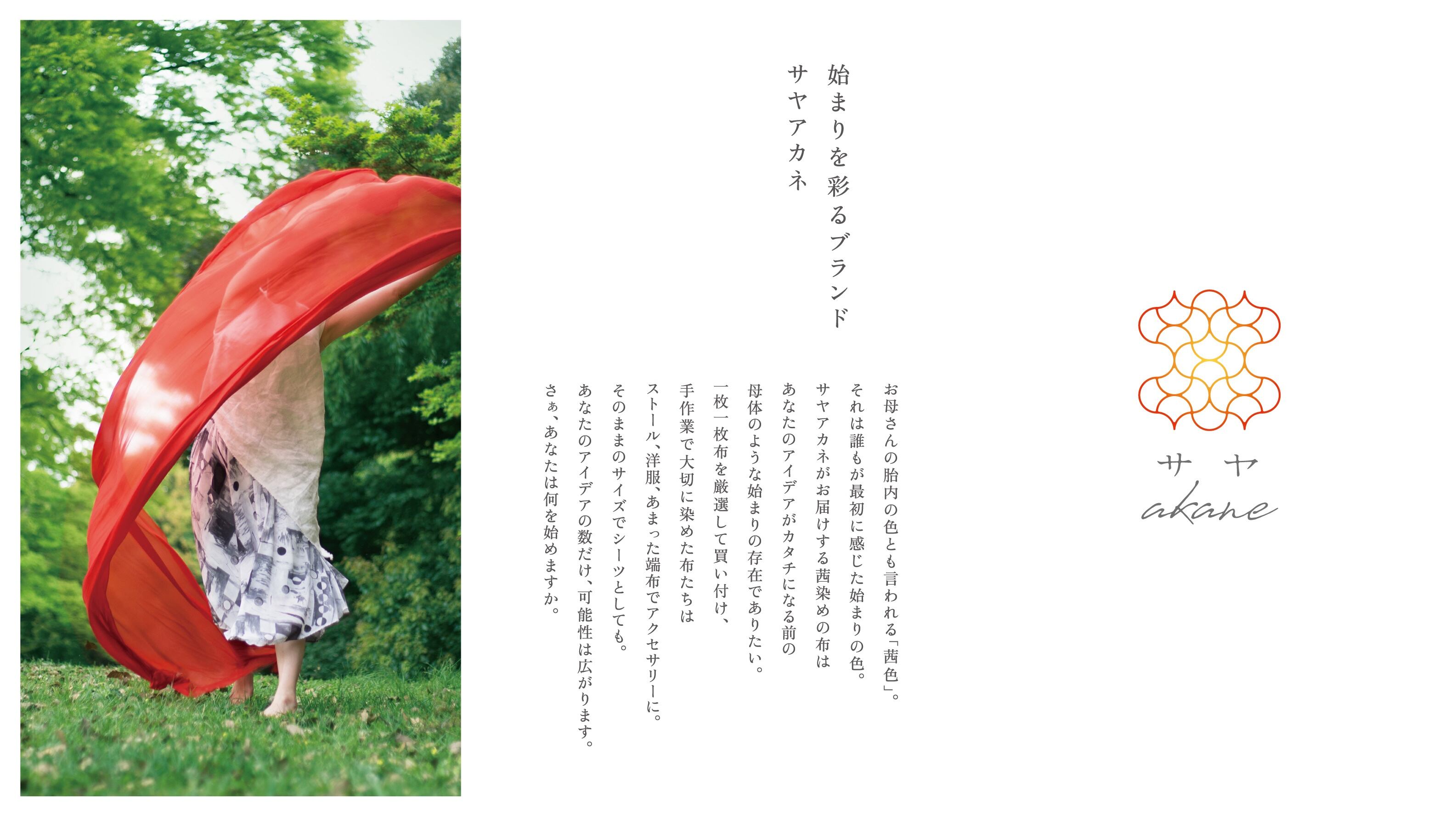 始まりを彩るブランド。お母さんの胎内の色とも言われる「茜色」。 それは誰もが最初に感じた始まりの色。 サヤアカネがお届けする インド茜で染め上げた茜染めの布は、あなたのアイデアがカタチになる前の 母体のような始まりの存在でありたい。ストール、洋服、あまった端布でアクセサリーに。 そのままのサイズでシーツとしても。 アイデアの数だけ、可能性が広がります。さぁ、あなたは何を始めますか。サヤアカネhttps://www.salonsaya-therapy.com/