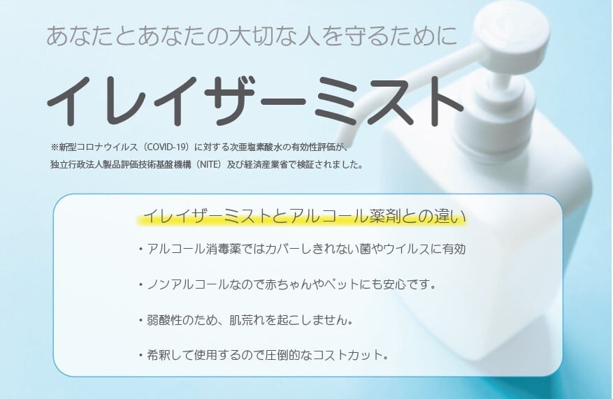 アルコール消毒薬ではカバーしきれない菌やウイルスに有効。次亜塩素酸ソーダの約8倍の除菌力‼ アルコールよりもはるかに除菌力あり ・ノンアルコールなので赤ちゃんにも安心。自然分解性が高く、有機物に触れると水に戻り、環境に優しく安全・安心。 ・希釈するので圧倒的なコストカット。従来のアルコール薬剤と比べてコストは約10分の1
