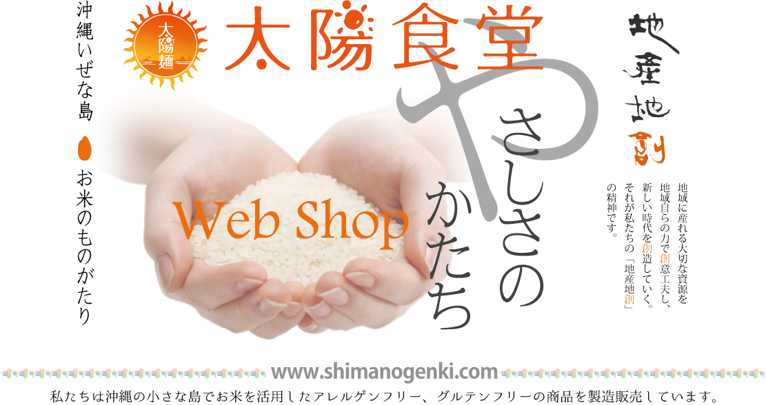 ■私たちの考え方 ■私たち小さなローカルの地は、常に拡大をめざし続ける社会にあって大きく翻弄され続けてきました。どこかの借り物の物差しで自らを計り、都市の背中ばかりを追いかけてきました。その中で多くの大切なものを置き忘れてきたような気がします。私たちはそれらをもう一度拾い集め、重ね合わせ繋ぎ直しながら、自らの身の丈の物差しで地域の未来を図っていきたいと考えます。また、伊是名島で新しい小さな挑戦が始まります。「小さいこと」それを原点として、そしてその小ささが地域の誇りであり続けるために。■地産地創 ■ 地域に産れる大切な資源を地域自らの力で創意工夫し、新しい時代を創造していく。それが私たちの「地産地創」の精神です。■身土不二■人と土(地域)は一体である。人の命と健康は食べ物に支えられ、食べ物は土(地域)が育てる。故に、人の命と健康はその土(地域)と共にある。これが私たちの」「身土不二」の理解です。■太陽麺 ■伊是名島は沖縄の米どころです。沖縄の太陽をいっぱいあびたおいしいお米が生産されています。しかし、精米過程などで出る規格外米といった割れたお米や小粒のお米は、流通の中で取り上げられることはありませんでした。私たちは、この規格外米を中心に特殊製粉することにより、米粉だけのおいしい麺づくりを実現しました。さらには製麺工程も島外に外注することなく、身の丈サイズのローテクで丁寧に手作業で島の中で行うことにより、雇用の場の創出も実現できると考えています.WEB http://www.shimanogenki.com/スタッフブログhttp://shimanogenki.ti-da.net/