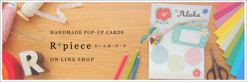【 手作りカードの温かさ 】 + 【 飛び出すわくわく 】手にした人みんなの心がふわっと温かくなるような可愛くて楽しい飛び出すカードをお届けしたいハンドメイドカードR*piece(れいんぼーぴーす)のon line shopです。----------------------------------------------------------------------------------------------------------------------------------こちらのon line shopでは、●オーダーメイドでお作りする『 ハードカバーの飛び出すカード 』と●ダウンロードするだけで 飛び出すカード作りに気軽に挑戦できる『飛び出すカードのテンプレート』を販売しています。どうぞみなさんの心にしっくりぴったりの1枚が見つかりますように(*^^*)♪----------------------------------------------------------------------------------------------------------------------------------◆ R*pieceサイト ◆https://rpiece-card.com/◆ みんなのギャラリー ◆みなさんが作ったカードの写真を募集中♪(Instagram)https://instagram.com/rpiece_mingallery(投稿ページ)https://rpiece-card.com/popupcard_making/mingallery/◆ YouTube ◆http://www.youtube.com/c/Rpiece-card