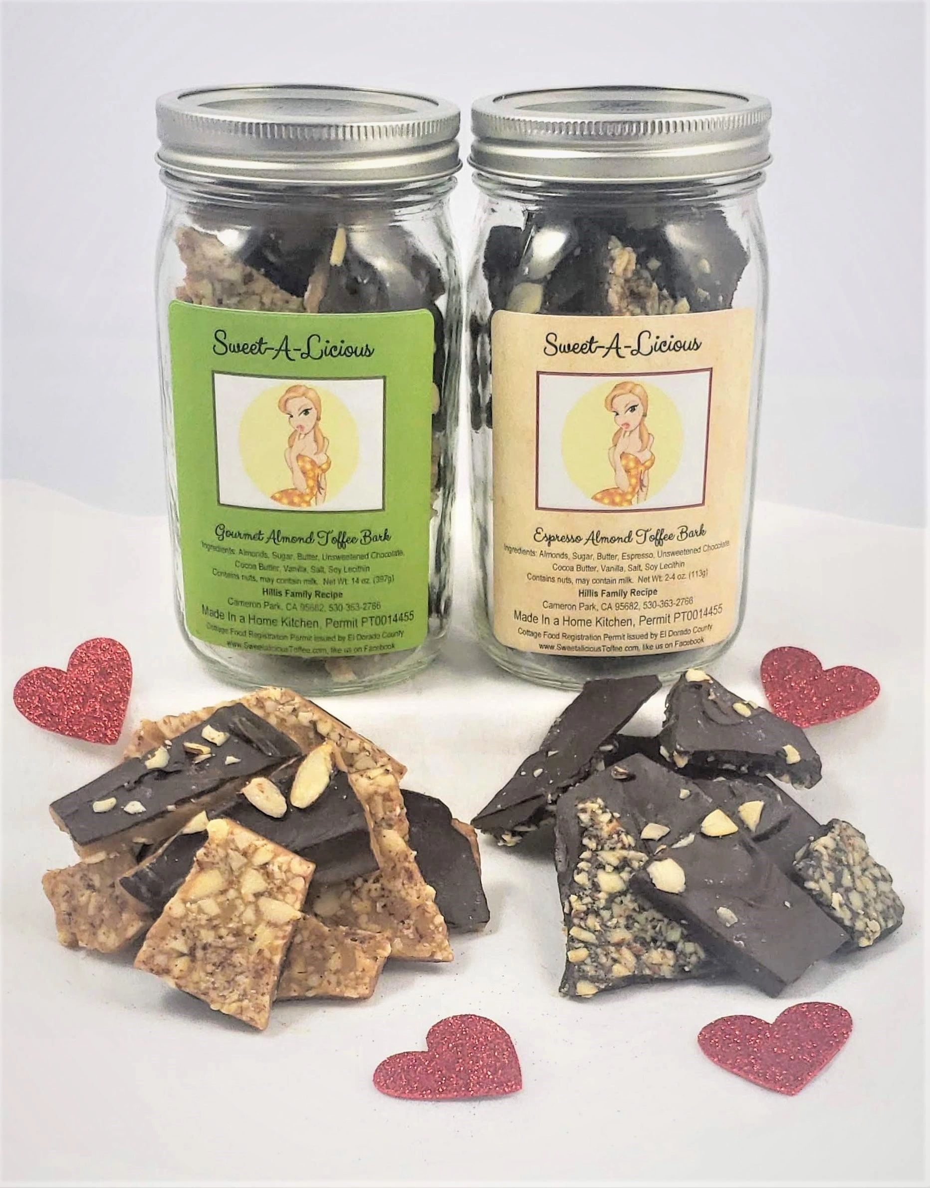 Delicious almond toffee, espresso toffee, and nuts. All made locally in Cameron Park, CA. They are sweetalicious!