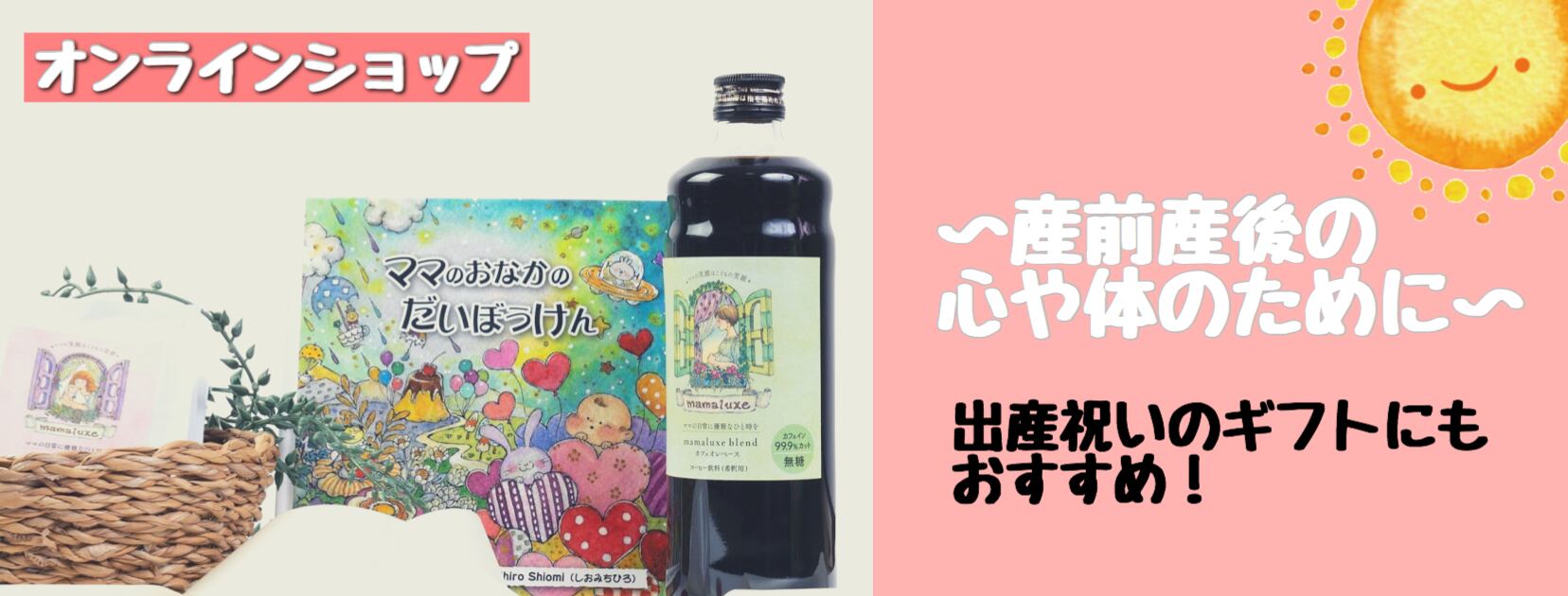 産前産後専門整体たいよう整骨院が運営するオフィシャルグッズショップです。「ママのおなかのだいぼうけん」の絵本、CD。カフェインレスコーヒー販売ショップです。