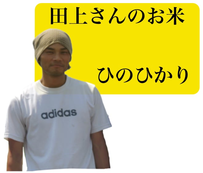 ※購入メールやcontactの返信メールが迷惑メールに入る場合があります。特にGmailは迷惑メールになるようです。返信がない場合は迷惑メールフォルダをご確認ください。田上 貴之(たのうえ たかゆき) 品種 / ヒノヒカリ(熊本県)水の利に恵まれた土地やタニシの力など、自然の力を信じて見守る自然農法農家さんの話に魅了され、米づくりの道へ地元のライスセンター(籾摺り所)でのアルバイトがきっかけで、農 家さんの話を聞くようになり、米づくりにひかれていったという田 上さん。○年に自分で田んぼを買い米づくりを始めました。無農薬・ 無肥料栽培にこだわり、除草にはジャンボタニシの力を借りていま す。まめに田んぼに足を運びつつも、自然の力を信じて、あえて「手 を入れすぎず見守る」のが田上さん流です。乾燥に気を配り、微調整を重ねるできるだけ稲の都合に合わせて、完熟を迎えた時点で刈り入れし、 収穫したお米はゆっくり手間ひまかけて乾燥します。お米の品質の 落ちない水分量までは風だけで乾かし、その後は日中の気温に合わ せた加温乾燥に。夜は乾燥をとめて休ませるため、水分の戻りも計 算して、翌日に微調整を行い、最適な水分量である 15 ~ 15.5% に なるよう心を配ります。甘くてもちもち、冷めてもおいしいお米甘くてもちもち、炊きたてでも冷めてもおいしいため、お弁当にも おすすめの田上さんのお米。「ふつうのお米しか食べたことのない人 に、このおいしさを伝えたい」と語ります。