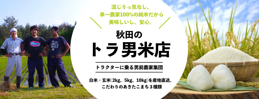 ●トラ男とは〜トラクターに乗る男前たち〜“3 FARMERS + 1 PRESENTER”トラクターに乗る男前農家集団「トラ男」は専業農家の3代目である3人の「つくり手」と、彼らの想いを伝える1人の「つたえ手」の4人のチームです。カッコイイ農業を実践するべく、日々挑戦しています。●3つのこだわり〜トラ男米が選ばれる理由〜1、混じりっけなし、Single Origin Rice2、発送前に精米するから、いつも新鮮3、顔が見えるから、安心●つながりを変える〜たべ手とつくり手がつながる場をつくる〜スーパーに並んでいるお米、毎日食べている食卓に並んでいるお米、農家の顔が思い浮かぶものはあるでしょうか?昔は近かったはずの「つくり手」と「たべ手」の距離が今はすごく離れてしまっているように感じます。「お米なんてどれも同じ」そう思っている人も多いかもしれません。でもつくり手によってそのお米の味も特徴も変わってくるんです。まずは「流通」を変える。産地から直接お届けして顔の見える関係を作りたい。そして「つながる場」をつくる。イベントで試食してもらったり、お店で実際に食べてもらったり。たべ手とつくり手の距離をグッと縮めていきます。●おむすびスタンドANDON秋田のトラ男米をつかって「炊きたてむすびたて」のおむすびを食べられるお店おむすびスタンドANDONを2017年10月に東京にOPEN!ぜひ遊びに来てください。公式WEBサイトhttps://andon.shop/〒103-0023東京都中央区日本橋本町3-11-10営業時間:11:00〜23:00(日・月曜定休)・東京メトロ地下鉄「小伝馬町駅」から徒歩4分・東京メトロ地下鉄「三越前駅」から徒歩6分・JR総武線「新日本橋駅」から徒歩5分