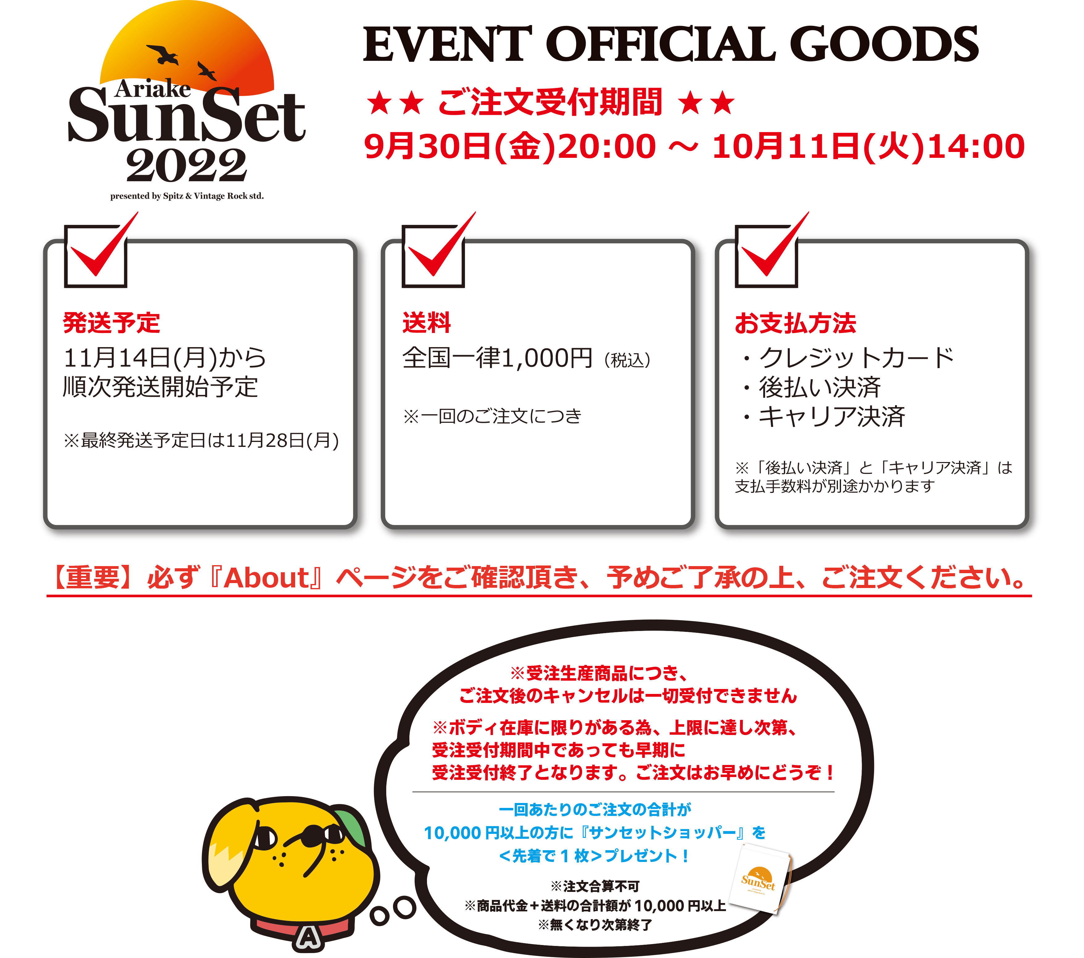 ※当サイトに掲載された文章や画像等の著作物を無断で引用・転載することを禁止します。『有明サンセット 2022』 イベントオフィシャルグッズの通販サイトです。営業日: 平日12:00~17:00休業日: 土・日・祝『有明サンセット 2022』 イベントオフィシャルサイト https://www.sun-set.info/以下を必ずご確認頂き、予めご了承の上でご注文ください。■ご注文受付期間2022年9月30日(金)20:00 ~ 10月11日(火)14:00■発送予定2022年11月14日(月)頃から順次発送開始予定最終発送日は2022年11月28日(月)予定■ご購入特典1注文IDの商品代金と送料の合計額(支払手数料は含まず)が10,000円(税込)以上の場合、先着で 『サンセットショッパー』 を1枚プレゼントします。※先着であり、予定枚数終了次第でご購入特典はご連絡無しで終了します。※特典は配布終了済です。特典有無に関するお問い合わせへの返答は割愛とさせて頂きます。※複数の注文IDの合計額を合算し、10,000円(税込)を超える場合はご購入特典対象外です。■送料・配送について1回のご購入(1注文ID)につき、全国一律1,000円(税込)の送料(配送作業手数料込)をお客様にご負担頂きます。弊社任意にて「日本郵便ゆうパケット」 「日本郵便レターパック」 「佐川急便」のいずれかで発送をします。発送方法・発送日・受取日時の指定は出来ません。ご注文時に備考欄等に上記希望のご記載を頂く場合もご希望には<一切添えません>。商品発送時に noreply@thebase.in からメールで発送案内をします。配送伝票番号を記載しますので、お客様ご自身で追跡サービスをご利用の上、配送状況をご確認ください。日本郵便: https://trackings.post.japanpost.jp/services/srv/search/input佐川急便: https://www.sagawa-exp.co.jp/send/howto-search.html*注意事項*・営業所留め対応は出来ません。・営業所留めでご注文を頂く場合は、ご注文のキャンセル処理をします。・お客様のお受取り状況や、住所登録の不備等により、配送業者での保管期限を超えた場合は弊社に購入品が返送されます。弊社に返送が届いた後の再発送配送料は「着払い」で送付します。(配送業者は弊社任意)また、ご注文時の登録情報に不備がある場合は、お客様と正しい情報の確認が出来た後に再発送をします。■お申込に際しての注意事項※受注生産商品につき、ご注文後の変更やキャンセルは<一切受付できません>。※ボディ在庫に限りがある為、ボディ上限に達し次第、受注受付期間中であっても早期に販売終了となります。※ご注文は間違いのない様に<落ち着いて、慎重に>お願いします。※1商品につき<5点まで>購入可能です。※備考欄に記載される内容は<発送内容には一切反映されません>ので、記載しないでください。※通販開始日にご注文が殺到する事が予測されます。基本的にご注文受付順に発送をします。ご注文混雑状況次第では、通販開始日9月30日のご注文であっても、発送開始初日の発送とはなりません。全てのご注文の発送完了時に『有明サンセット 2022』イベントオフィシャルHPまたはオフィシャルTwitterアカウントにて発送完了のお知らせをしますので、お知らせがあるまでの間は発送をお待ちください。発送作業にスタッフ稼働を集中させて頂く為、発送完了のお知らせがあるまでの間の発送予定日に関するお問い合わせにつきましては、返答は割愛とさせて頂きます。※1回のご注文につき1,000円(税込)の送料(配送作業手数料込)のご負担を頂きます。ご注文には個別の注文IDが割り当てられます。<いかなる場合でも、複数の注文IDの送料を一括にまとめる事は一切出来ません>。ご注文完了後に『複数注文をまとめてください』等のお問い合わせが無い様、くれぐれもご注文は間違いのない様に<落ち着いて、慎重に>お願いします。※1注文IDの中で、一部商品のキャンセルや数量の変更はシステム上<一切出来ません>。ご注文単位で全てキャンセルとなります。※ご使用されているパソコン・スマホのモニターおよび携帯電話のメーカー・機種・画面設定等により、実際の商品の色と異なって見える場合がございます。※一度ご使用になった商品や、お客様のご都合で汚れやキズ等が生じたもの、また、お客様のご都合による交換やキャンセル・返品は<一切お受け出来ません>。■決済方法について下記より決済方法をお選びください。いずれも<ご注文完了と同時に決済が確定します>。くれぐれもご注文は間違いのない様に<落ち着いて、慎重に>お願いします。また 『後払い決済』 と 『キャリア決済』 は別途支払手数料がかかります。●クレジットカード決済●後払い決済●キャリア決済< 支払手数料について >・クレジットカード決済: 無料・後払い決済: 360円(税込/1回)・キャリア決済: 300円(税込/1回)------------------------------------------< クレジットカード決済 >以下のクレジットカードをご利用いただけます。VISA / MasterCard・デビットカードやプリペイド式のクレジットカードのご利用も可能です。ただし、デビットカード・プリペイドカードに関わらず全ての