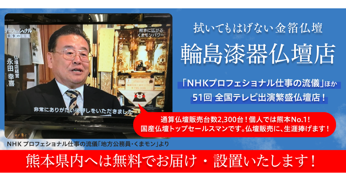 金箔が拭いてもはげない国産仏壇 輪島漆器仏壇店のオンラインショップです。 熊本で“百歳まで長生き”輪島百年・仏壇を取り扱う仏壇店です。輪島漆器の技術を活かした天然うるしで仕上げ、金箔を拭いてもはげない百年仕上げが特長です。
