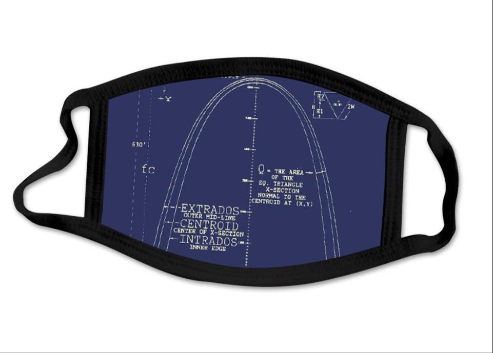 Eero Saarinen Gateway Arch blueprints on face masks and throw pillows.