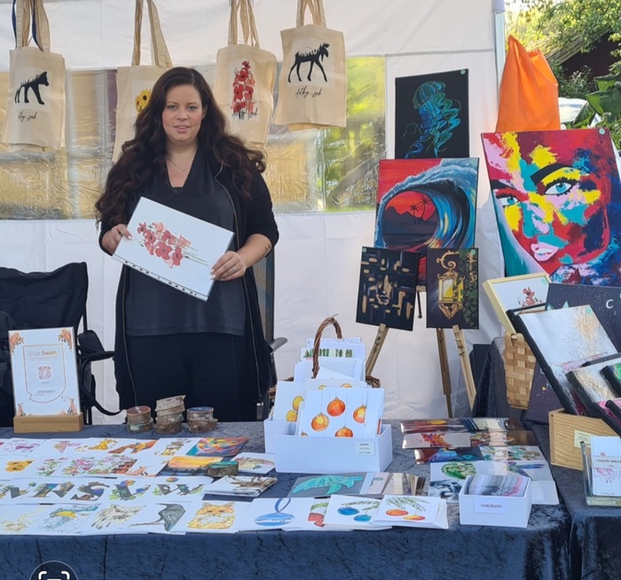 Målningar i akvarell och akryl. Billiga vykort och bokmärken. Magneter och nyckelringar till ett bra pris. Tygpåsar med egna motiv. Barnposters och prints i olika storlekar