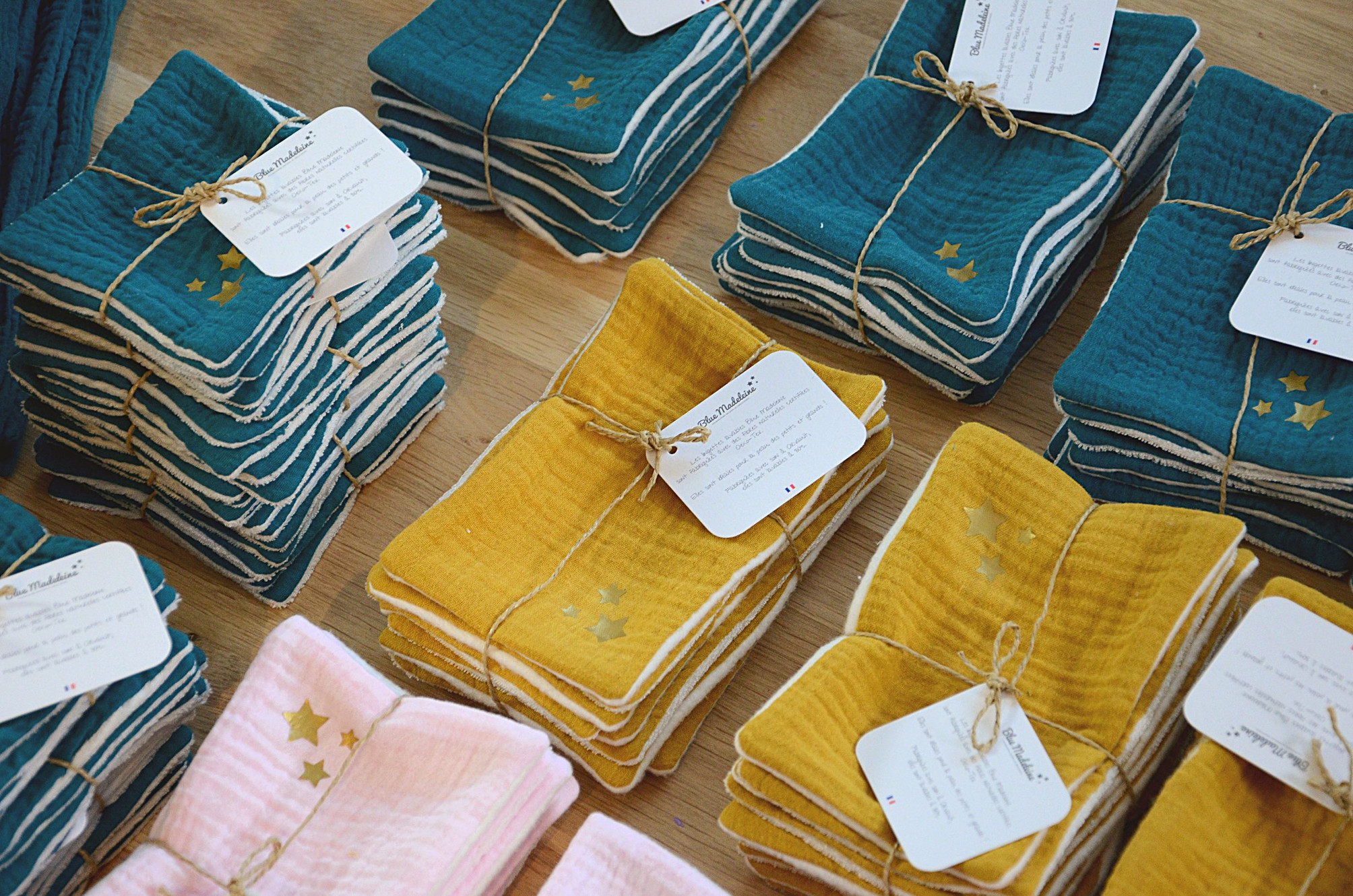 Boutique en ligne Blue Madeleine. Accesoires bébé, enfants, déco, pour Elle, pour Lui et box cadeaux. Créations fait-main en double gaze de coton.