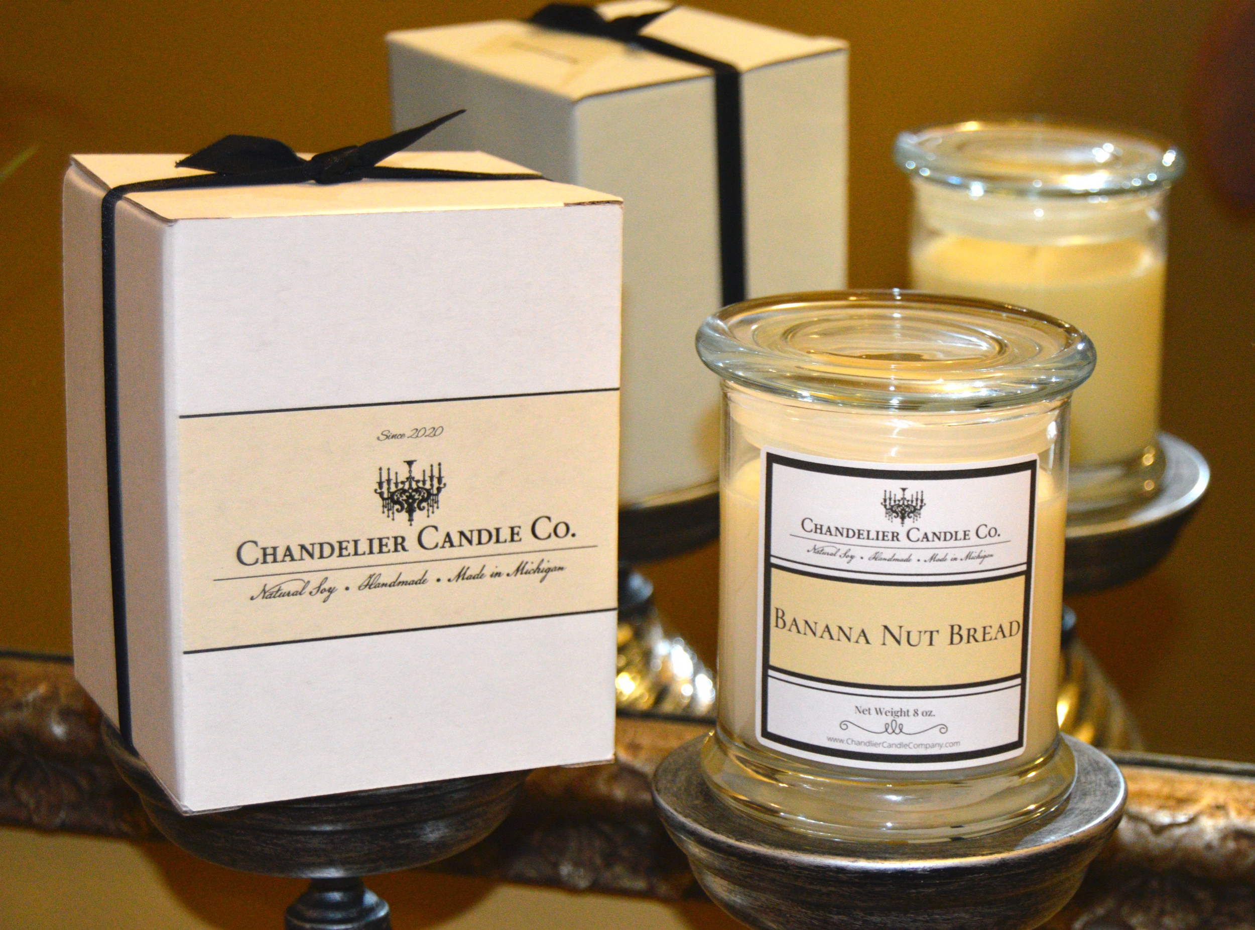 Chandelier Candle Co. handpours each one of their all-natural soy candles. We use high quality scent oils and vessels. Made in Michigan