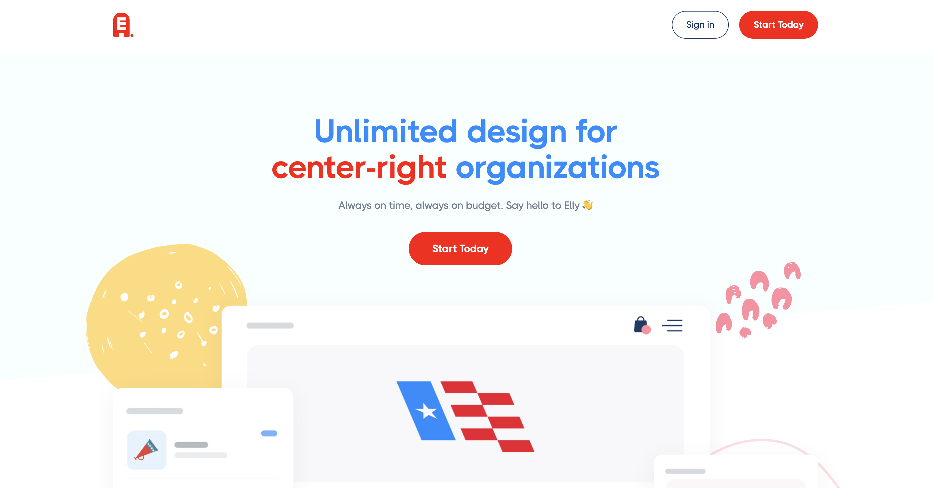 Unlimited design for center-right organizations. Always on time, always on budget. Say hello to Elly 👋