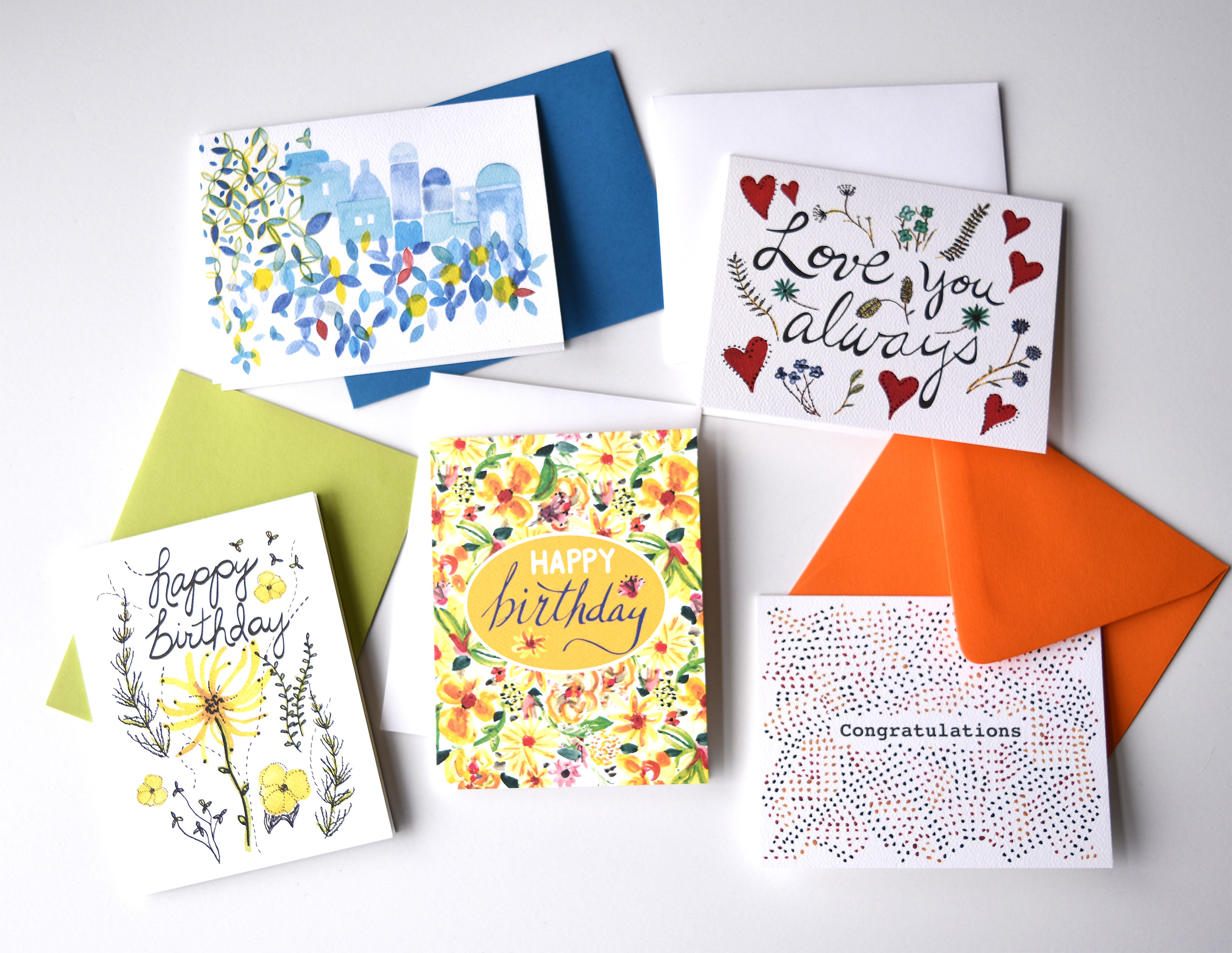 Greeting cards colorful flowers, abstract patterns and sketches in ink. Each card is made with love in my home studio. I start painting in gouache or watercolor, design in Illustrator and finish on my printer. MJ Studio designs greeting cards