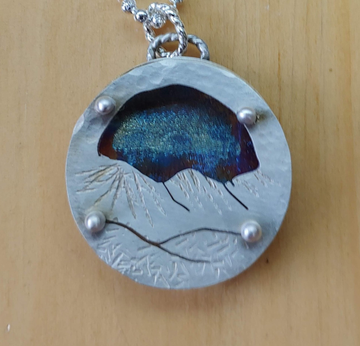 River of Mountains Studio. Artisan, handmade jewelry. Sterling silver, copper and brass are used to make unique pendants, earrings and bracelets. Pieces are created with a nature theme. Inspired by the wild craggy mountains of Montana and the blue rolling mountains of Virginia.